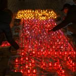 На Михайлівській площі столиці біля Стіни пам’яті ветерани російсько-української війни виклали з лампадок фігуру диспетчерської вежі летовища як символу мужності та незламності захисників Донецького аеропорту.
