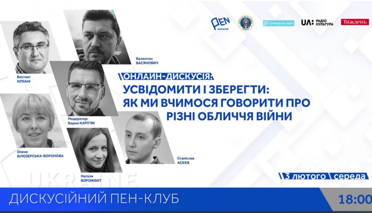 Події на Сході України вже стали історичними, але війна та окупація тривають й дотепер. Це непроста сучасність, яку нам допомагають осмислити саме мистецькі твори. 3 лютого в межах дискусійного ПЕН-клубу відбулася розмова «Усвідомити і зберегти: як ми вчимося говорити про різні обличчя війни».