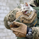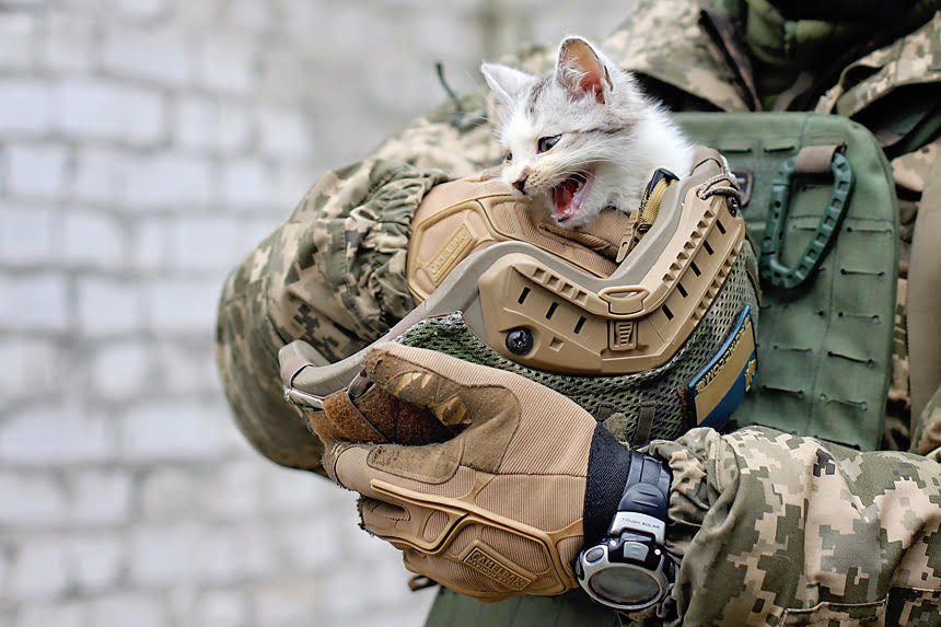 «У першу чергу задача військових – захищати! І брати наші менші теж потребують захисту. Ми відповідальні за них. Сподіваюся, ці фото дадуть поштовх суспільству захищати тварин. Я їхав на службу зранку. Було темно. Я побачив кошеня на дорозі і не зміг проїхати повз, забрав його з собою та привіз у КП «Центр захисту тварин» на лікування. Я зараз шукаю йому господаря і займаюся його лікуванням», – розповів військовий з позивним «Кречет».