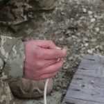 Далі — знову ж таки за командою інструктора — кожен курсант пропускає шнур між пальцями. Керівник занять, тимчасовий виконувач обов’язків начальника циклової комісії військово-інженерних дисциплін підполковник Олег В’юнов розповідає: «Робимо пальцями «хеві-метал-рок», пропускаючи шнур між вказівним, середнім і безіменним пальцями, фіксуємо шнур таким чином. Великим пальцем притискаємо сірник головкою до зрізу. Кожен курсант тримає коробок із сірниками у вільній руці, ще три сірники — міцно в зубах. І за командою — вогонь».