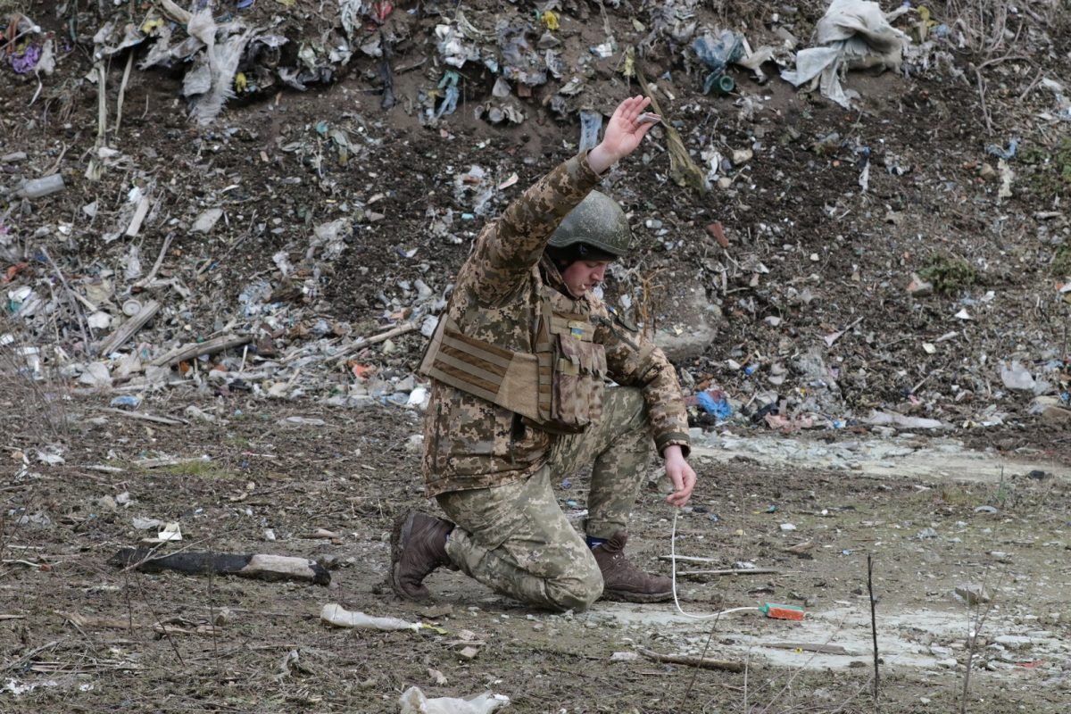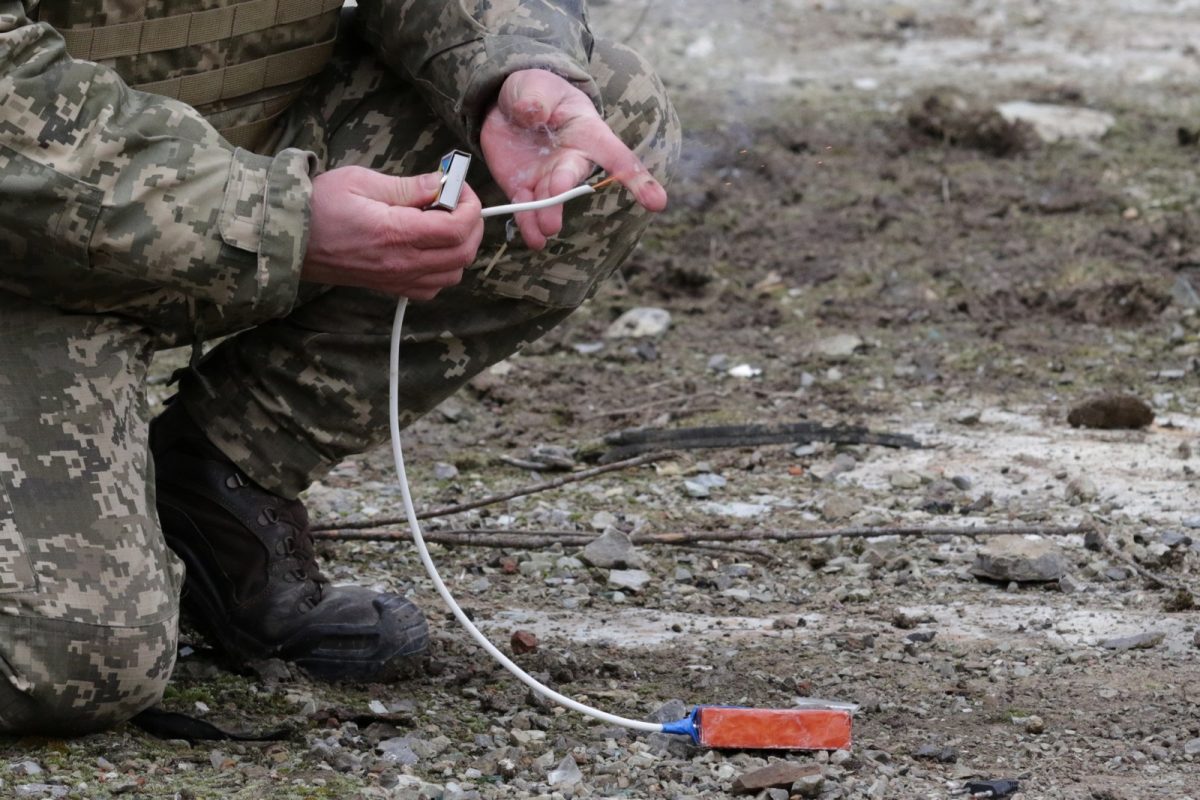 Лунає команда «Вогонь!». Курсант натискає кнопку і там, де закладені тротилові заряди, лунають вибухи.
