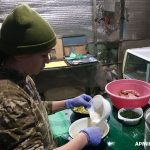 — Меню «розробляємо», виходячи з побажання більшості. Готую так, щоб вистачило на два рази кожному, адже процес приготування їжі досить трудомісткій, а інших справ на позиціях ніхто не скасовував, ми ж тут не на курорті — ділиться військовий. — Готові страви зберігаємо в похідних холодильниках. Холодоагенти постійно привозять, тому проблем зі зберіганням їжі та швидкопсувних продуктів навіть тут, на позиціях, немає.