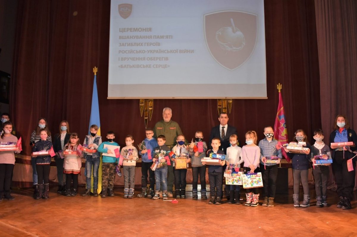 У Сумах вшанували пам’ять загиблих героїв-учасників АТО/ООС і Революції Гідності. 77 дітей загиблих в АТО/ОО захисників та Героїв Небесної Сотні отримали іменні срібні кулони «Батьківське серце». Загалом такі пам’ятні знаки планується вручити 180 дітям Сумщини. Про це повідомляє сайт Міністерства у справах ветеранів України.