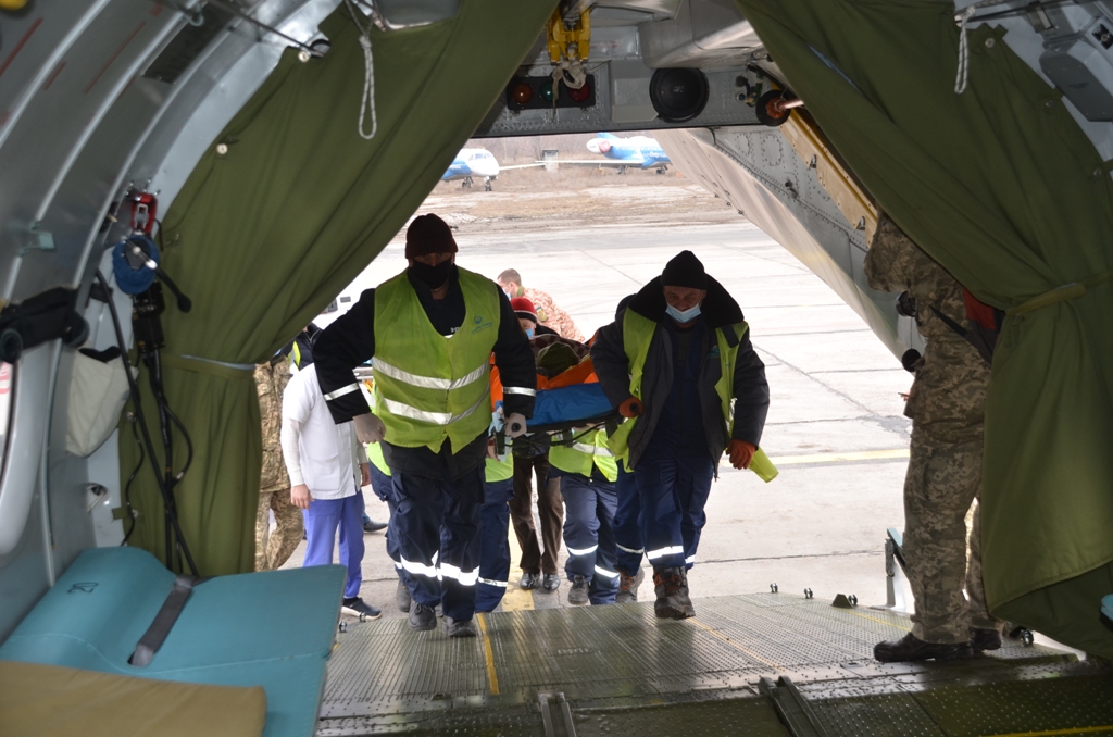 Літак прибув на військовий майданчик аеродрому «Бориспіль». Згодом військових спеціалізованим транспортом доправили до Національного військово-медичного клінічного центру «ГВКГ» у столиці.
