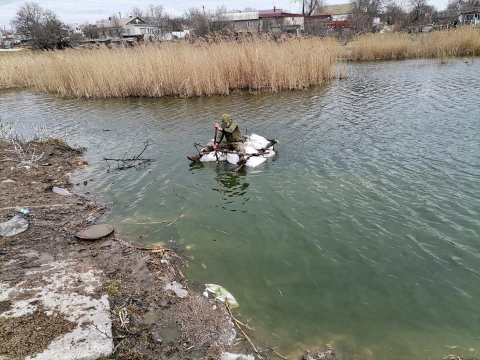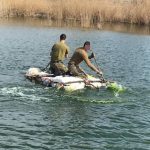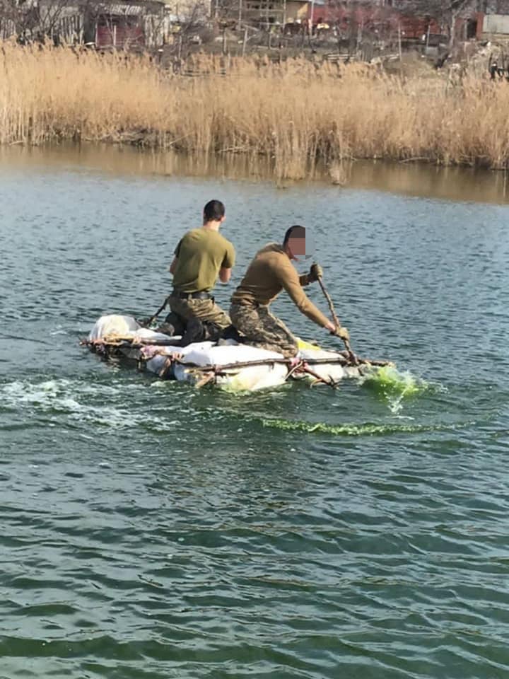 Наступним етапом стало виготовлення плотів. З урахуванням обмеження часу, який було відведено на виконання завдання, курсанти успішно впоралися з цією роботою. Їм знадобилося пів години, щоб сконструювати та зробити зручні й легкі плоти. Великі лантухи вони набили порожніми пластиковими баклажками і зв’язали між собою мотузками. Вийшли доволі міцні засоби переправи через водну перешкоду, які могли витримати двох розвідників. Завдання було ускладнено тим, що всі роботи треба було виконувати приховано, не припиняючи пильно стежити за діями противника.