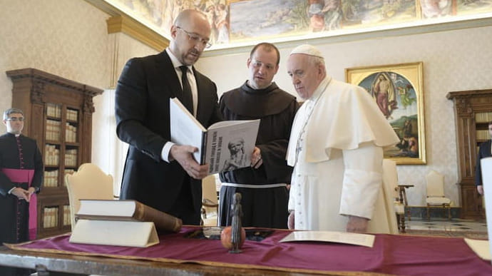 Шмигаль, зі свого боку, подарував главі католицької церкви факсимільне видання “Віденського Октоїха” та репродукцію скульптури “Гірка пам’ять дитинства”, яка встановлена у Національному музеї Голодомору-геноциду в Києві. Крім того, урядовець вручив папі книгу Рафаеля Лемкіна “Радянський геноцид в Україні”. Загалом зустріч понтифіка та українського прем’єра тривала пів години.