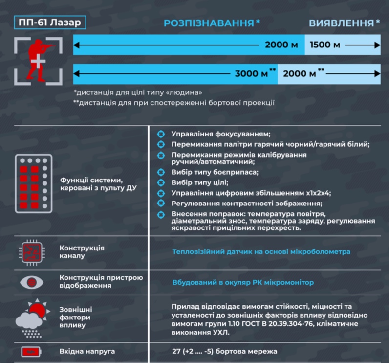 «Ці приціли тепер мають тепловізійний та оптичний канали. Тепловізійний канал дозволяє виявляти цілі на відстані у 3 км, дальність розпізнавання, зокрема, становить 2 км. Ці показники є однаковими для обох наших розробок», − наголосили в компанії.