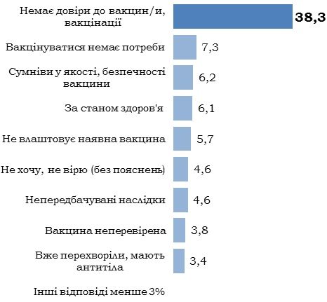 Як ви можете бачити, серед тих, хто не готовий вакцинуватися, 38 % не довіряють вакцині. Якщо ж додати тих, хто сумнівається в її безпечності (6 %), переконані, що вона неперевірена (4 %), а також тих, хто заявив, що наявна вакцина не влаштовує (6 %) – противників щеплення буде вже 54 %. І це попри те, що серед опитаних 36 % ймовірно мали чи мають хворих у своєму домогосподарстві, при цьому з них 26 % населення точно мали справу з COVID-19, а ще 10 % – ймовірно мали.
