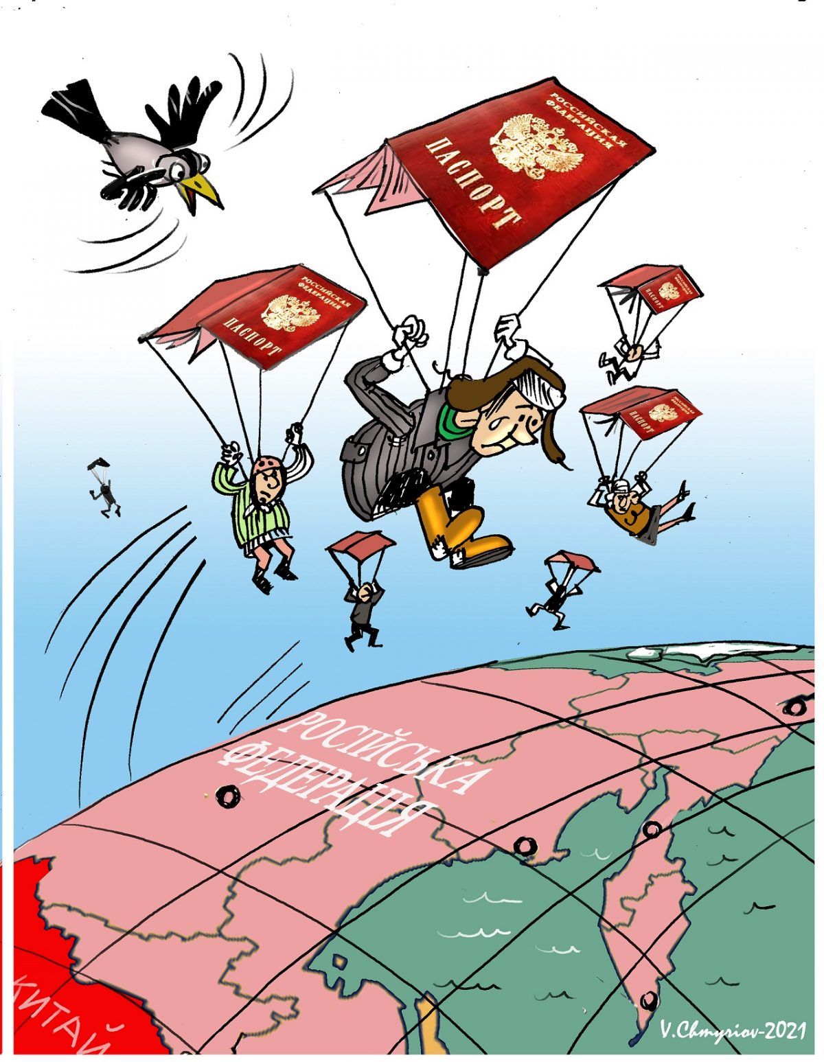…За якийсь останній рік-півтора населення Російської Федерації дало приріст на понад шістсот тисяч «новонароджених» громадян… Головне — обійшлося все це тихо й мирно! Без отих перинатальних центрів, без традиційних жіночих страхів і зойків до і під час пологів, без традиційних пелюшок-памперсів, без колискових арій над крикливими чадами і, що найпримітніше, без отих родинних застережень-лякалок, що могли передувати появі ще цілої армії «новоспечених» росіян… «кохайтеся, мовляв, чорноброві, та не з москалями», як писав свого часу обачний і далекоглядний наш Кобзар.
