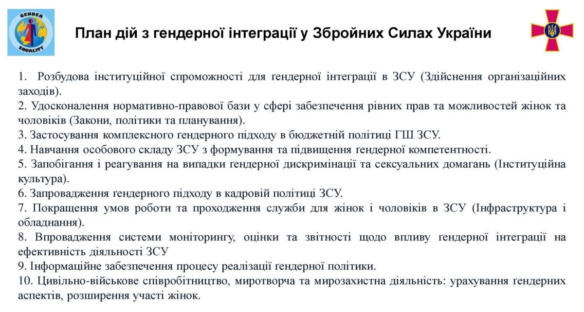 Важливі також навчання персоналу ЗСУ, інформаційне забезпечення. Це і сайти, і сторінки в соцмережах, де ми маємо висвітлювати все, що відбувається в ґендерній сфері, розтлумачувати, пропагувати ґендерний підхід тощо.