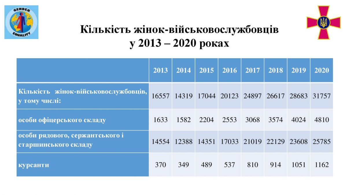 — Звичайно, перше, що наочно демонструє ситуацію, — це статистика. Якщо подивитися на актуальні дані про загальну кількість жінок у Збройних Силах, то починаючи з 2013 року ми спостерігаємо впевнену динаміку зростання: якщо порівнювати із 2013 роком — удвічі! Значно, майже втричі, зросла кількість жінок-офіцерів — тепер їх п’ять тисяч, а кількість дівчат-курсантів збільшилася майже вчетверо!