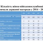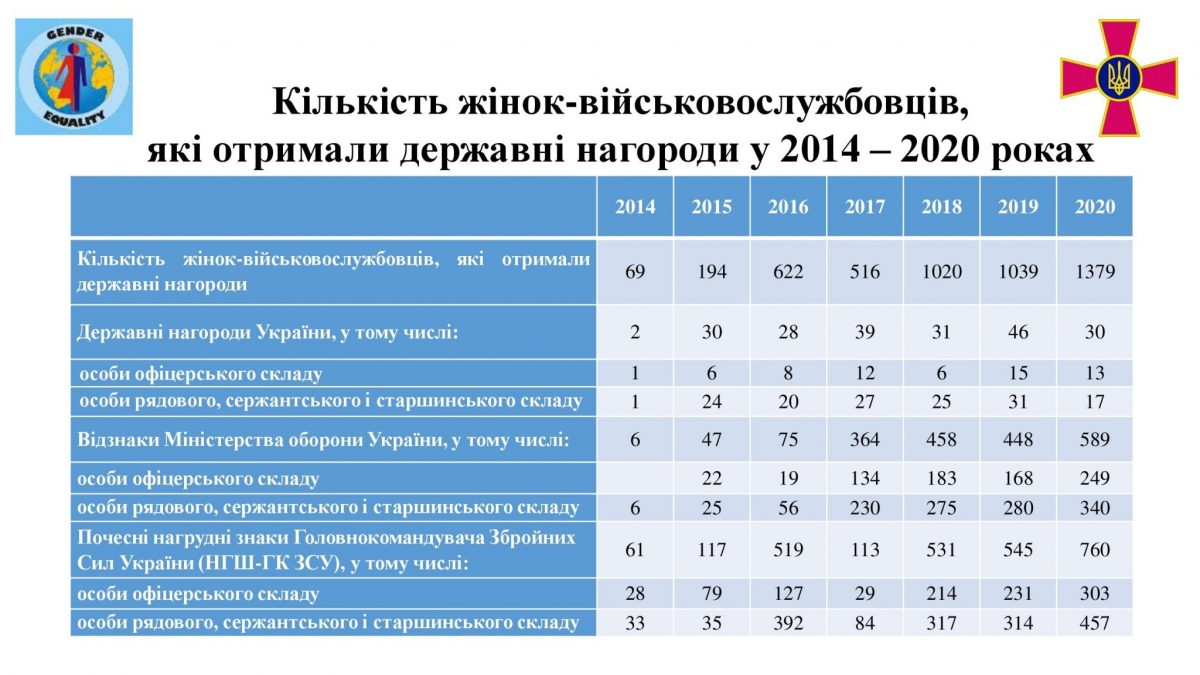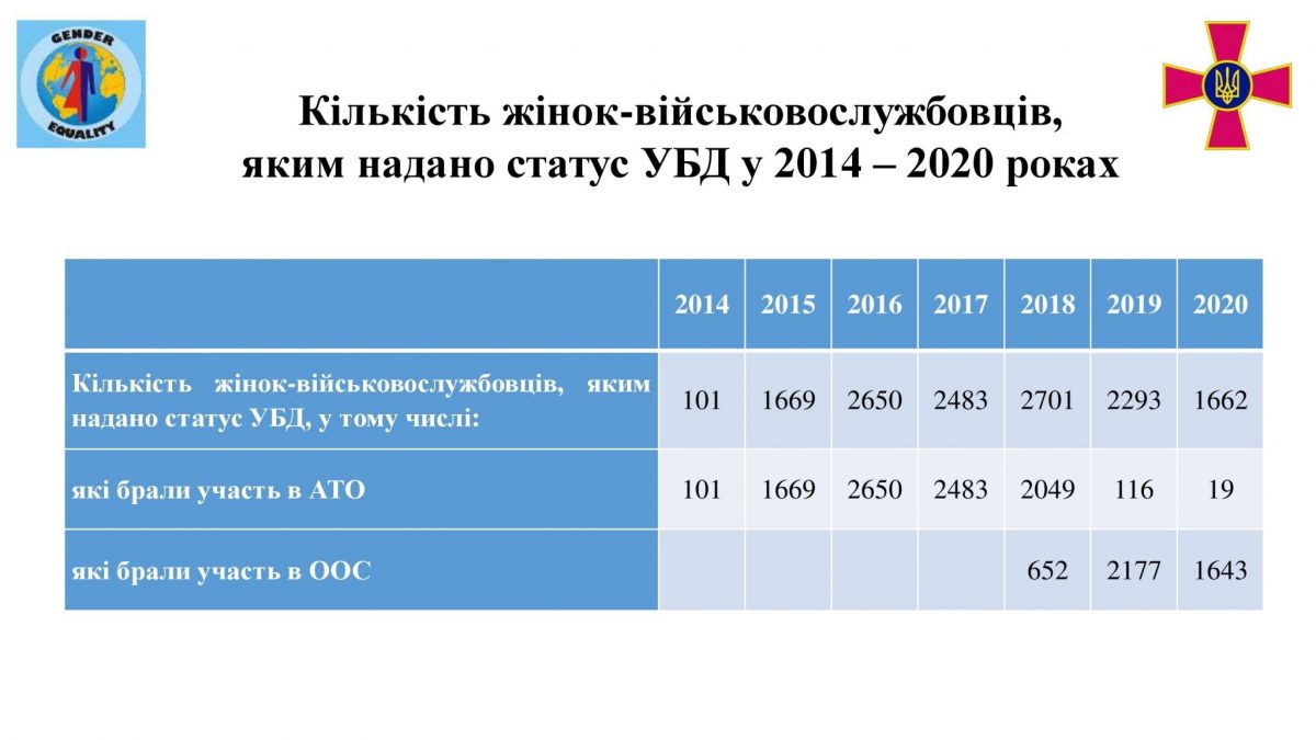 — Поступове відкриття посад для військовослужбовців — жінок рядового, старшинського, сержантського складу, а також офіцерського складу. Дівчата та жінки навчаються на спеціальностях та обіймають усе більше посад, які зовсім недавно були виключно чоловічими. Про це свідчать статистичні дані. Подивіться на кількість жінок-військовослужбовців, яким від 2014 року було надано статус УБД. Рахунок йде на тисячі! За цей час приблизно 4,5 тисячі з них отримали високі державні нагороди.