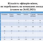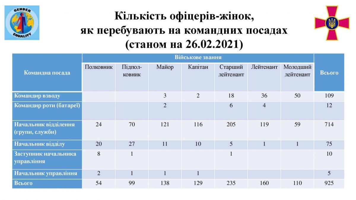 — Дуже важливий показник — це кількість жінок, які перебувають на командних посадах: командирів взводів — 109, рот (батарей) — 12, начальників відділення (групи, служби) — 714, начальників відділів — 75, заступників начальників управлінь — 10, начальників управлінь — 5. Згодом саме ці жінки зможуть претендувати на генеральські посади і звання. А головне тут те, що створюються умови для появи військовослужбовців-жінок в органах військового управління — в органах, де ухвалюють рішення.