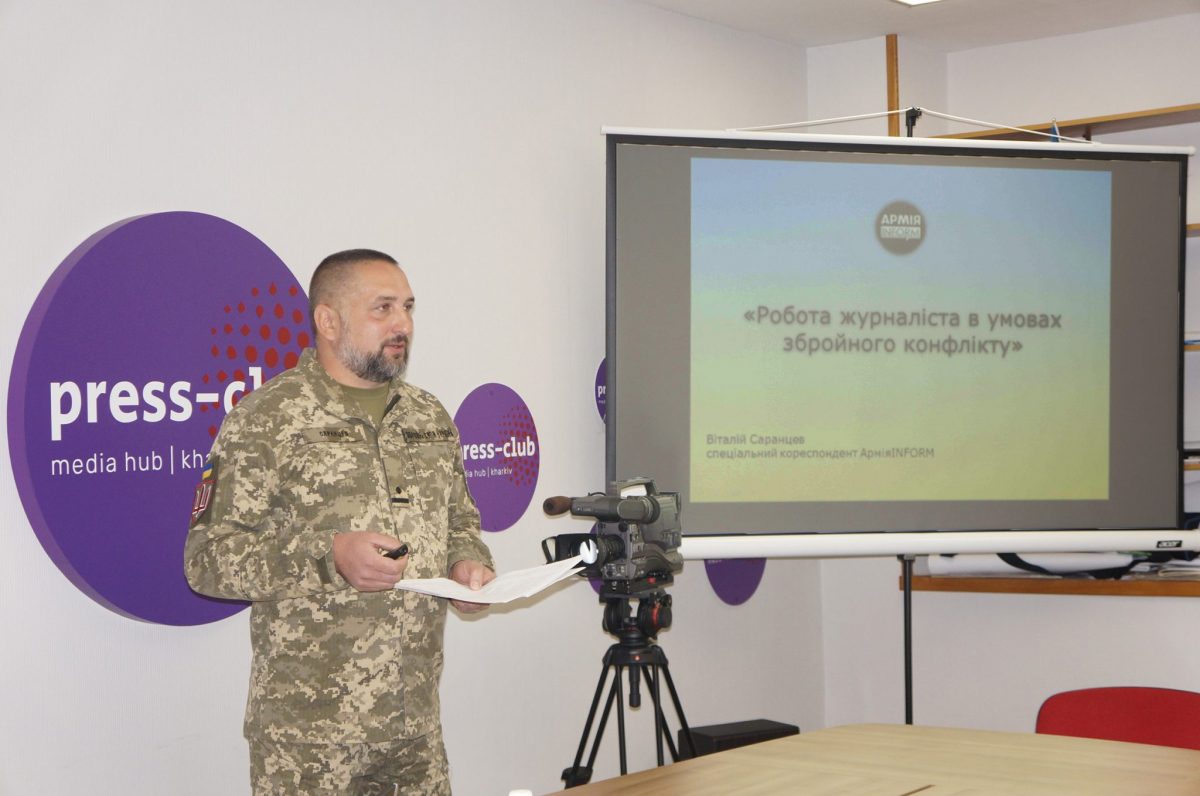 У студії Харківського пресклубу в рамках проєкту «Школа практичної журналістики та медіаграмотності» проведено тренінг «Робота журналіста в умовах збройного конфлікту». На заході були присутні представники цивільних мас-медіа з Харківської та Луганської областей. Тренером був кореспондент Інформаційного агентства АрміяInform майор Віталій Саранцев, який розкрив основні аспекти організації та роботи журналіста на території, де ведуться бойові дії.