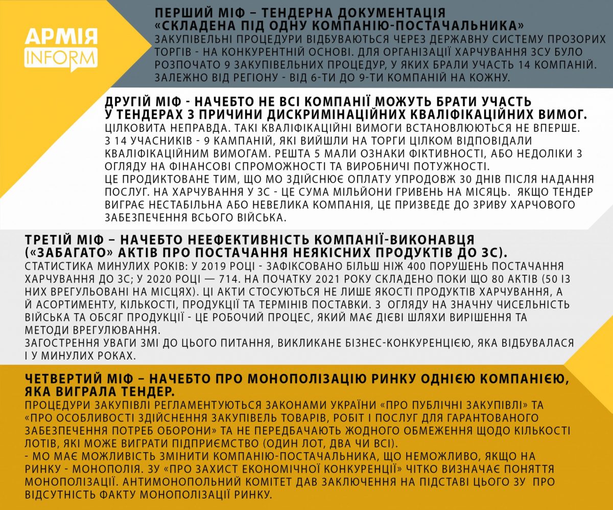 За його словами, перший міф щодо організації харчування в українській армії полягає в тому, що начебто тендерна документація складена під одну компанію-постачальника.