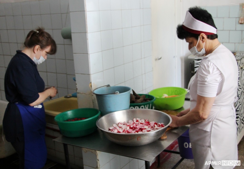 Їдальня розташована на першому поверсі шпиталю. Будівлю зведено ще у 1729 році. Вона – пам’ятка архітектури історичного значення. Ми прибули за годину до обіду. На кухні кипить робота: в одному приміщенні закінчується приготування котлет, в іншому – нарізка салатів, а в залах – сервірування столів… На годиннику 13:00 і до «роздатки» один за одним шикуються пацієнти: контрактники-учасники АТО/ООС, строковики, військові пенсіонери.