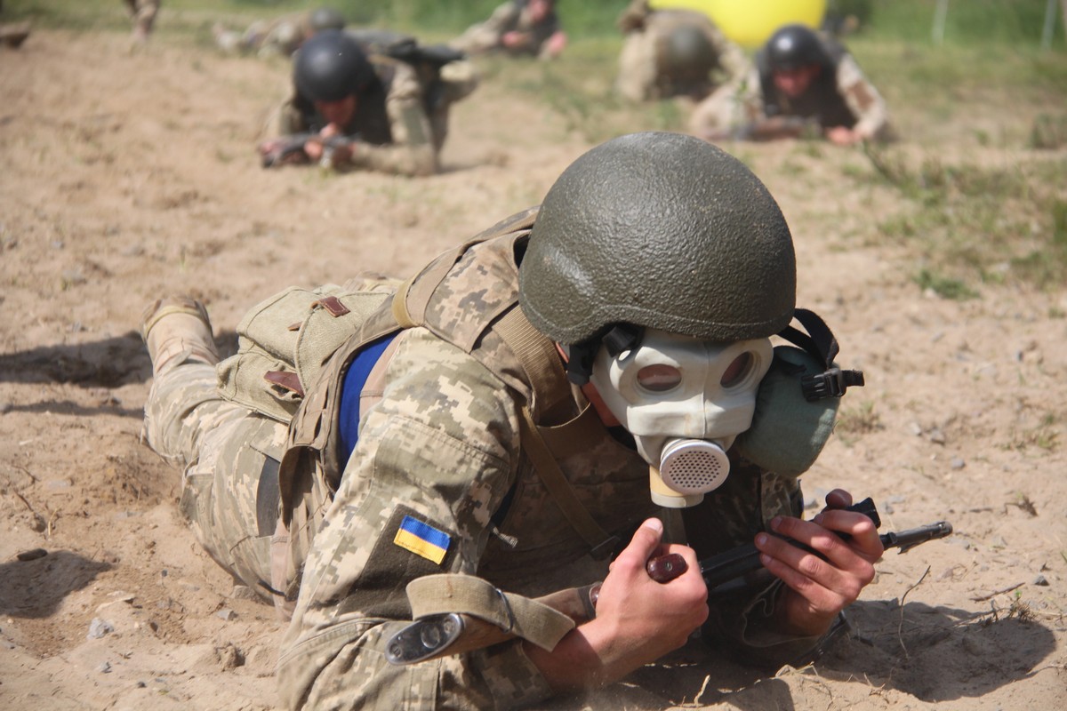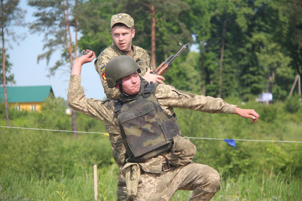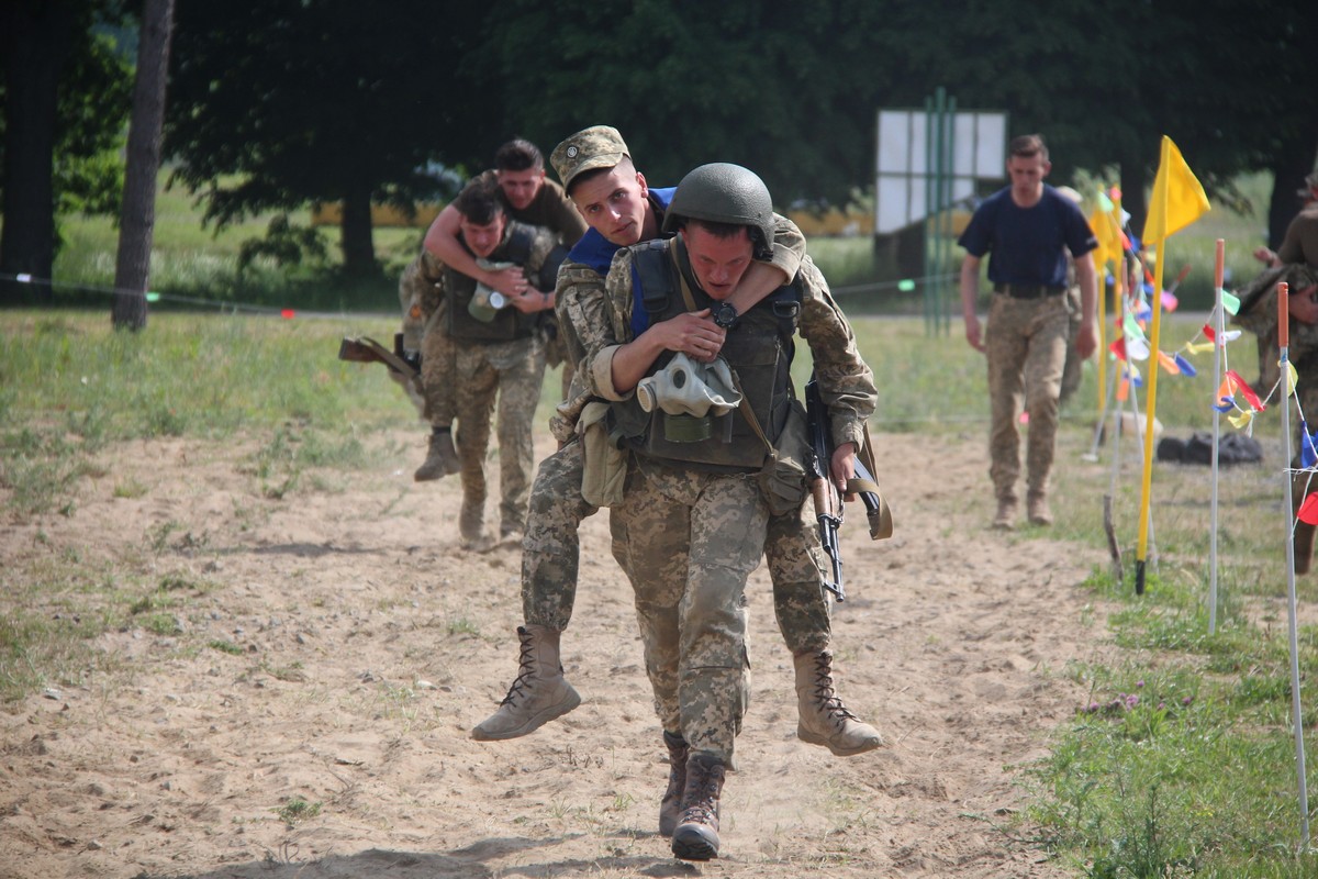 …Ось курсанти у повному спорядженні: з протигазом, підсумком, у бронежилеті, в шоломі та зі зброєю пробігли тисячу метрів. У багатьох по обличчю піт «градом». Однією рукою стирають його з лиця, а другою поправляють шолом і зброю. На певній ділянці лягають на землю й починають повзти по-пластунськи. Так 30 метрів. На цьому рубежі команда «Гази!» Ще 20 метрів повзуть у протигазах. Черговий рубіж: метання гранати на влучність. Дається дві спроби. Кидають, влучають у мішені. Беруть на себе умовного пораненого і з ним ще 50 метрів чимдуж до фінішу! Дехто, пробігаючи фінішну лінію, падає. Та, через мить піднімає голову і на стомленому обличчі видніється усмішка. Зміг, поборов, уклався в час!