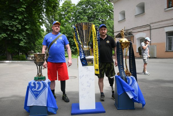 Цього разу приїзд до військового шпиталю став особливим завдяки тому, що представники фан-клубу київського «Динамо» привезли для хлопців приємні сюрпризи — три нагороди, які «біло-сині» завоювали за підсумками минулого сезону: чемпіонський трофей, Кубок і Суперкубок України. Захисники України не приховували емоцій, адже багато з них є вболівальниками київського «Динамо», тому можливість побачити кубки на власні очі, доторкнутися до них і сфотографуватися на згадку стала незабутнім подарунком. А двоє військових з ампутованими кінцівками спеціально приїхали з Ірпінського військового шпиталю, аби зустрітись з фанами.