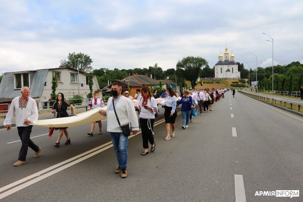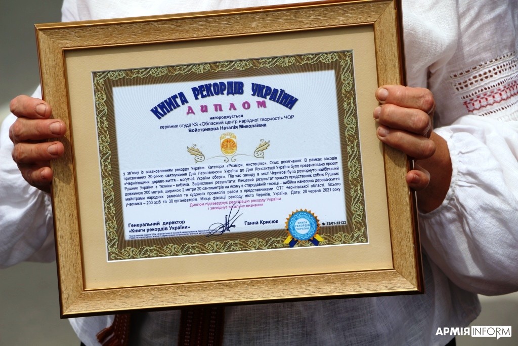 Відповідним спеціалістом було встановлено, що це є найбільший рушник в Україні довжиною 200 метрів, шириною 2 метри 20 сантиметрів, на якому в стародавній техніці – вибійка − було нанесено дерево життя – могутній український оберіг. До його виготовлення залучили близько 300 учасників.
