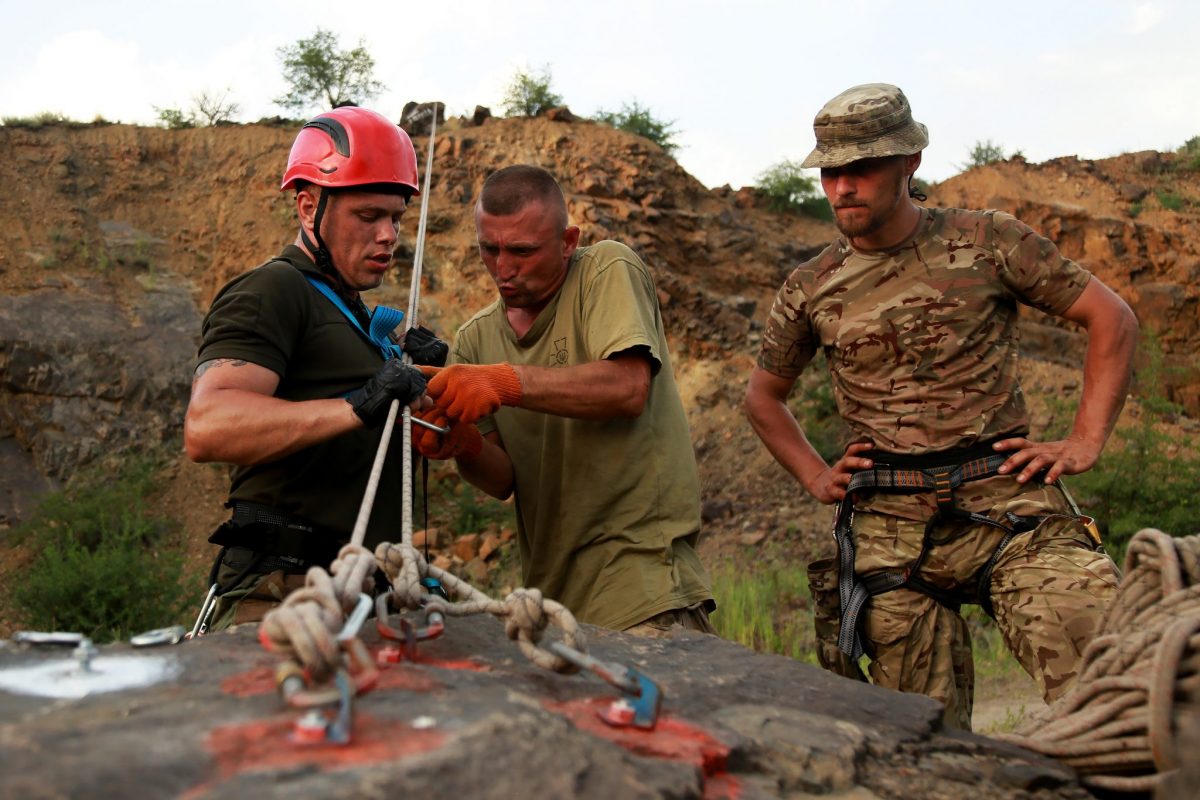 Військовослужбовці окремої гірсько-штурмової бригади проходять курс гірської підготовки. Навчання відбуваються на одному з полігонів Донеччини, де є місця імітації складних ділянок рельєфу, включених у програму підготовки особового складу.