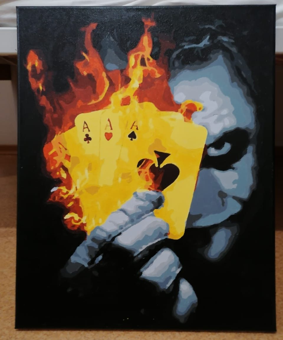 «Хоча це не зовсім малювання – це заздалегідь видруковані на полотні нумеровані контури майбутньої картини, які потрібно заповнити відповідними кольорами фарб. Першу картину – «Джокера», вже відправив додому. Після цього подумав – чи вийде у такий спосіб намалювати картину з фотографії, виявилося можна – в Інтернеті замовив полотно та фарби. Працював понад місяць, оскільки там дуже багато дрібних деталей, робив перерви. Працював дуже обережно – щоб гарно вийшло, бо хотів залишити цю картину на згадку. Це ми сфотографувалися колись ввечері в Одесі, на світлині синові п’ять років. 7 червня йому виповняється вже вісім – на Івана Купала», – усміхається офіцер.