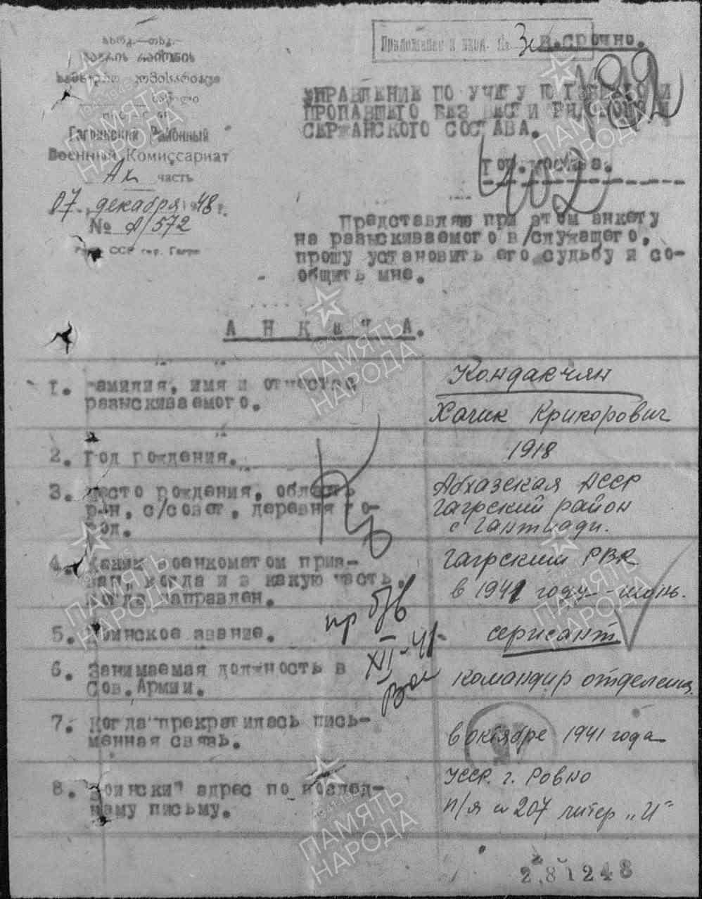 З медальйону стало відомо ім’я цього досі невідомого солдата. Ним виявився вірменин із Абхазії сержант Хачик Крикорович Кондакчян 1918 року народження, призваний Гагринським РВК Абхазької АРСР Грузинської РСР.