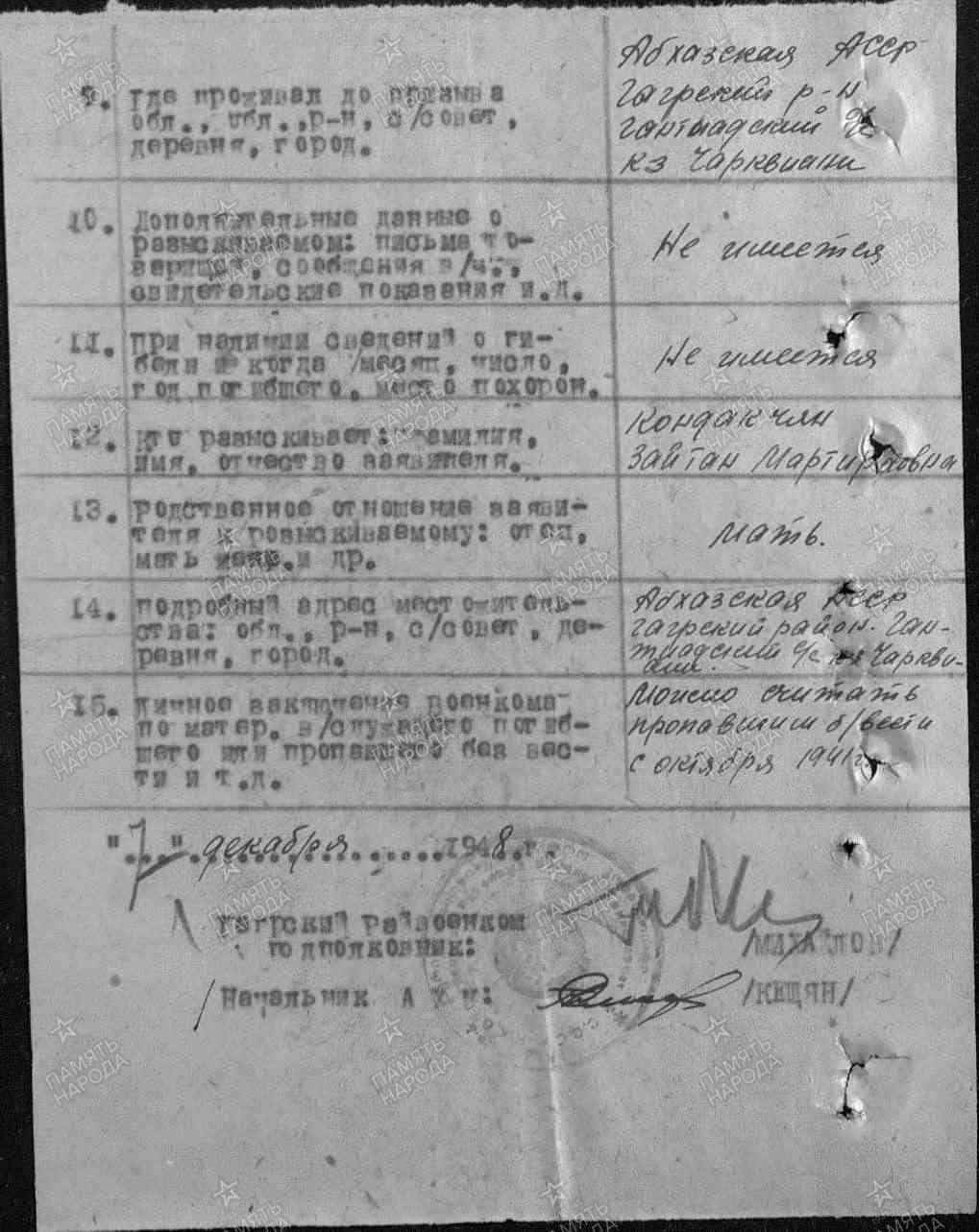 — Спілкуюся з онучкою рідного брата загиблого солдата, якого він вказав у своєму смертному медальйоні, — свідчить російська пошуковиця Наталія Дементьєва, давній друг і колега житомирського «Пошуку». — Виявляється, Хачика Крикоровича пам’ятає не лише вона, але й усі родичі і в Сочі, і в Абхазії, навіть у самій школі, де він викладав понад 80 років тому! Усі близькі родичі Хачика — мати, брат і сестри — поховані там, у рідному селі. Зовсім нещодавно, доживши майже до 100 років, помер двоюрідний брат солдата, Карпо. Все життя він як святиню зберігав лист Хачика, який його двоюрідна онука Тетяна дозволила оприлюднити.