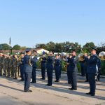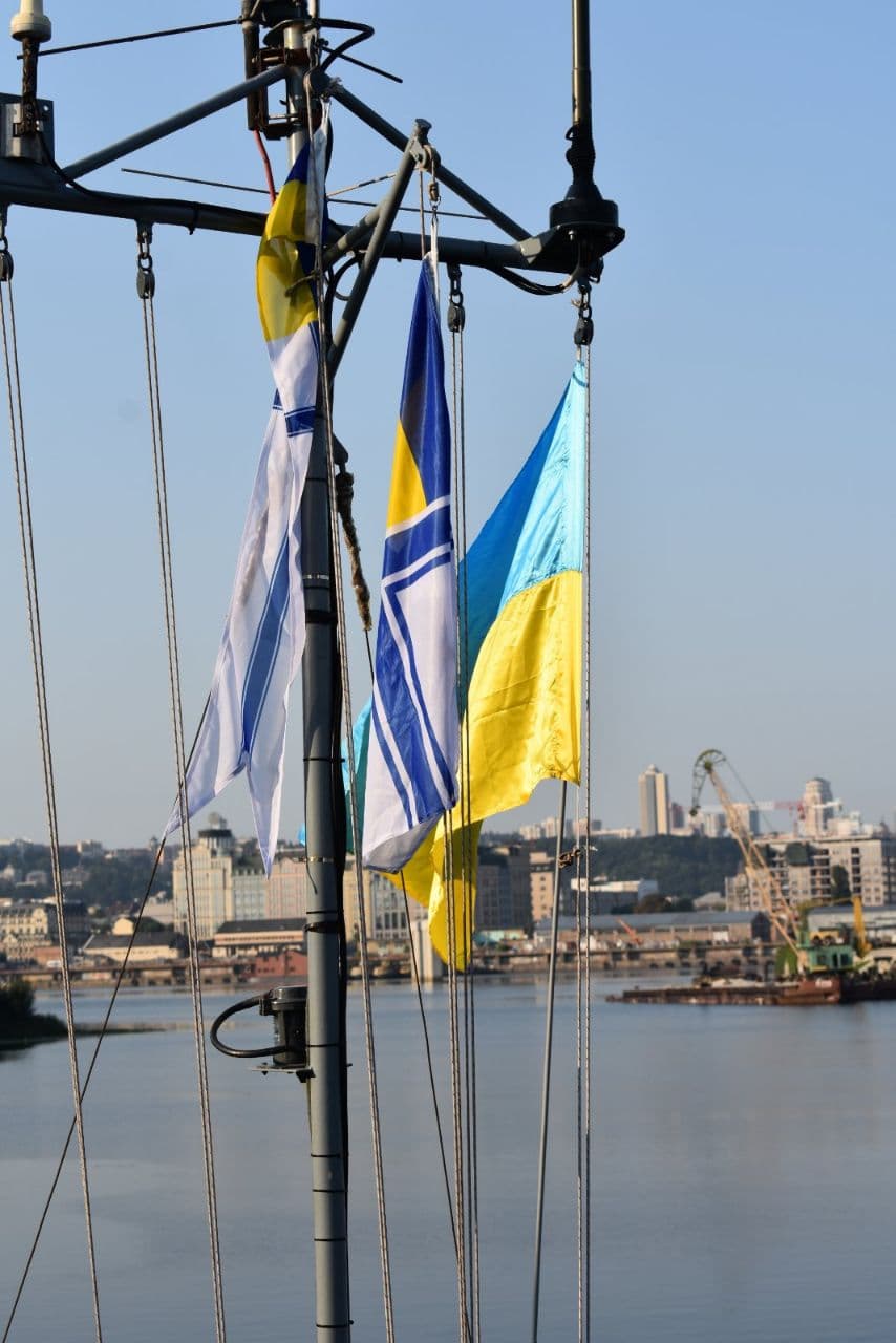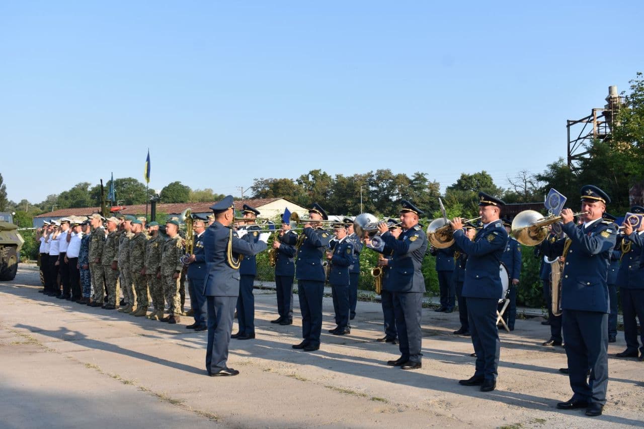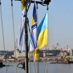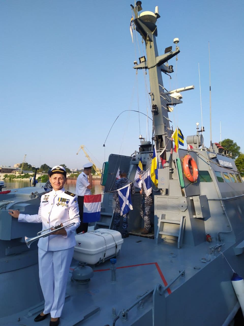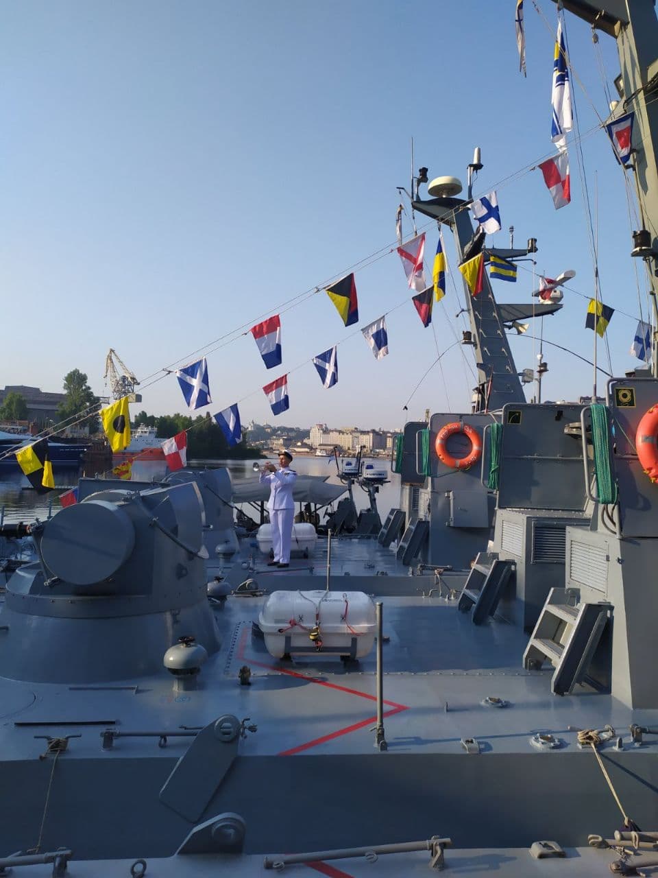 За встановленою морською традицією, підняття синьо-жовтого стягу, прапора ВМС та прапорів розцвічування пройшло під музичний супровід сигналіста, артиста 1-ї категорії військового оркестру окремої артилерійської бригади імені генерал-хорунжого Олексія Алмазова ВМС ЗС України старшого матроса Олени Богдан та колективу Центру військово-музичного мистецтва Повітряних Сил ЗС України.