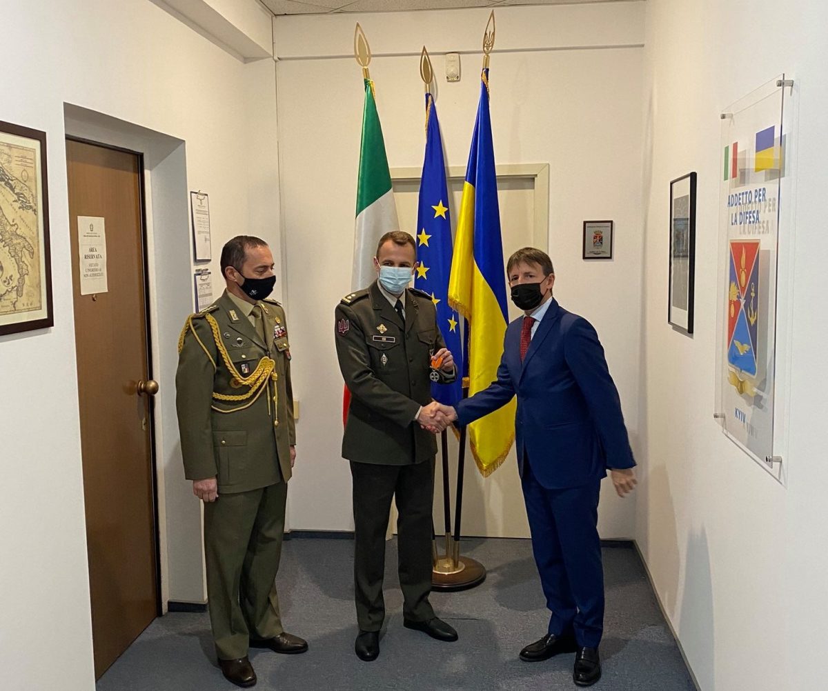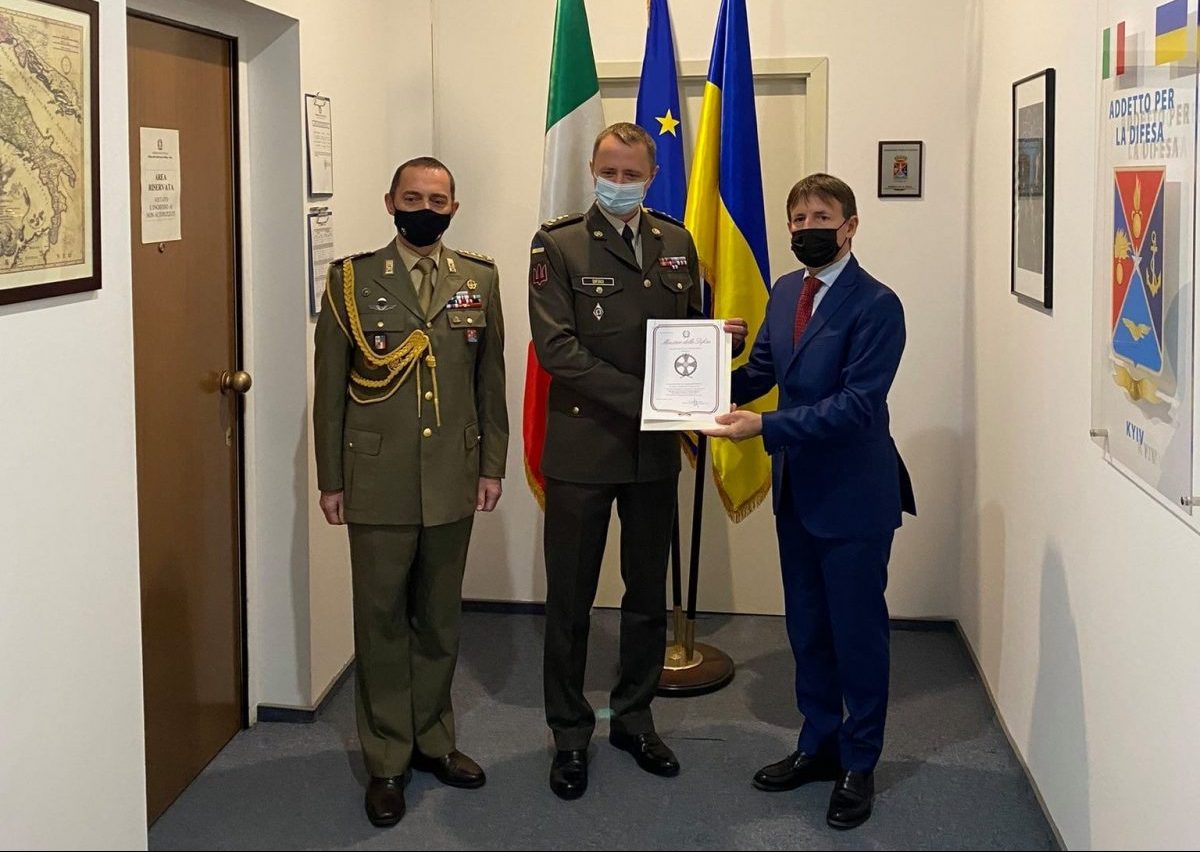 Надзвичайний і Повноважний Посол Італійської Республіки в Україні П’єр Франческо Дзадзо та Аташе з питань оборони посольства Італійської Республіки в Україні вручили медалі Міністерства оборони Італійської Республіки двом українським офіцерам, які проходили службу з контингентом Збройних сил Італійської Республіки в Афганістані в Гераті та Кабулі.