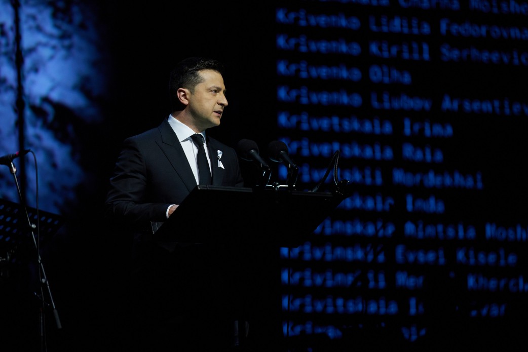 «У цьому місці нацисти розстріляли понад сто тисяч людей, – сказав Володимир Зеленський під час виступу. – У цьому місці важко говорити. На тисячі років його окупувала тиша. У цьому місці важко дихати. Тисячі дітей зробили тут останній подих. У цьому місці важко стояти. Тисячі куль збивали з ніг убитих саме тут, в урочищі Бабин Яр, що пронизане болем і криком, кров’ю і смертю. Місце, яке Господь покинув назавжди, а диявол оминає стороною. Це таке місце. 80 років тому тут сталися жахливі злочини».
