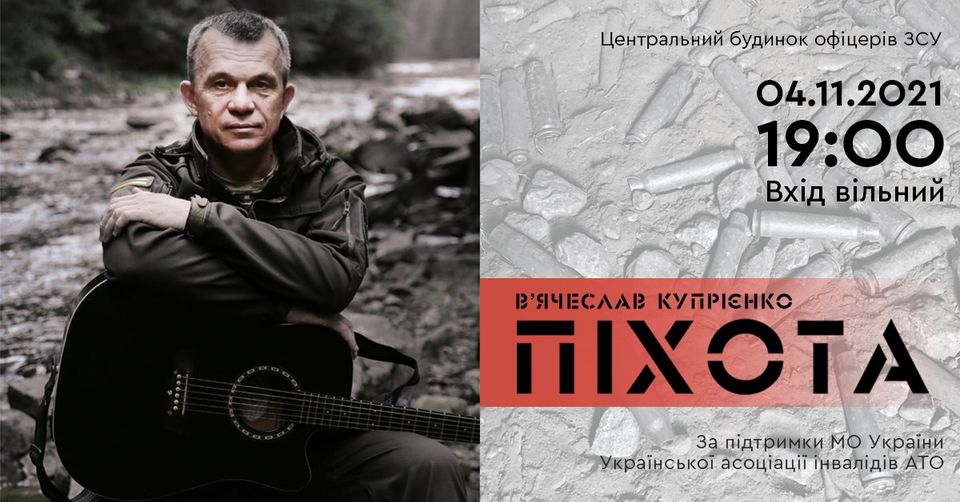 4 листопада о 19.00 у Центральному будинку офіцерів Збройних Сил України в рамках благодійного проєкту «Непереможні» відбудеться презентація нового альбому «Піхота» лауреата першого Всеукраїнського фестивалю «Пісні, народжені в АТО» В’ячеслава Купрієнка.