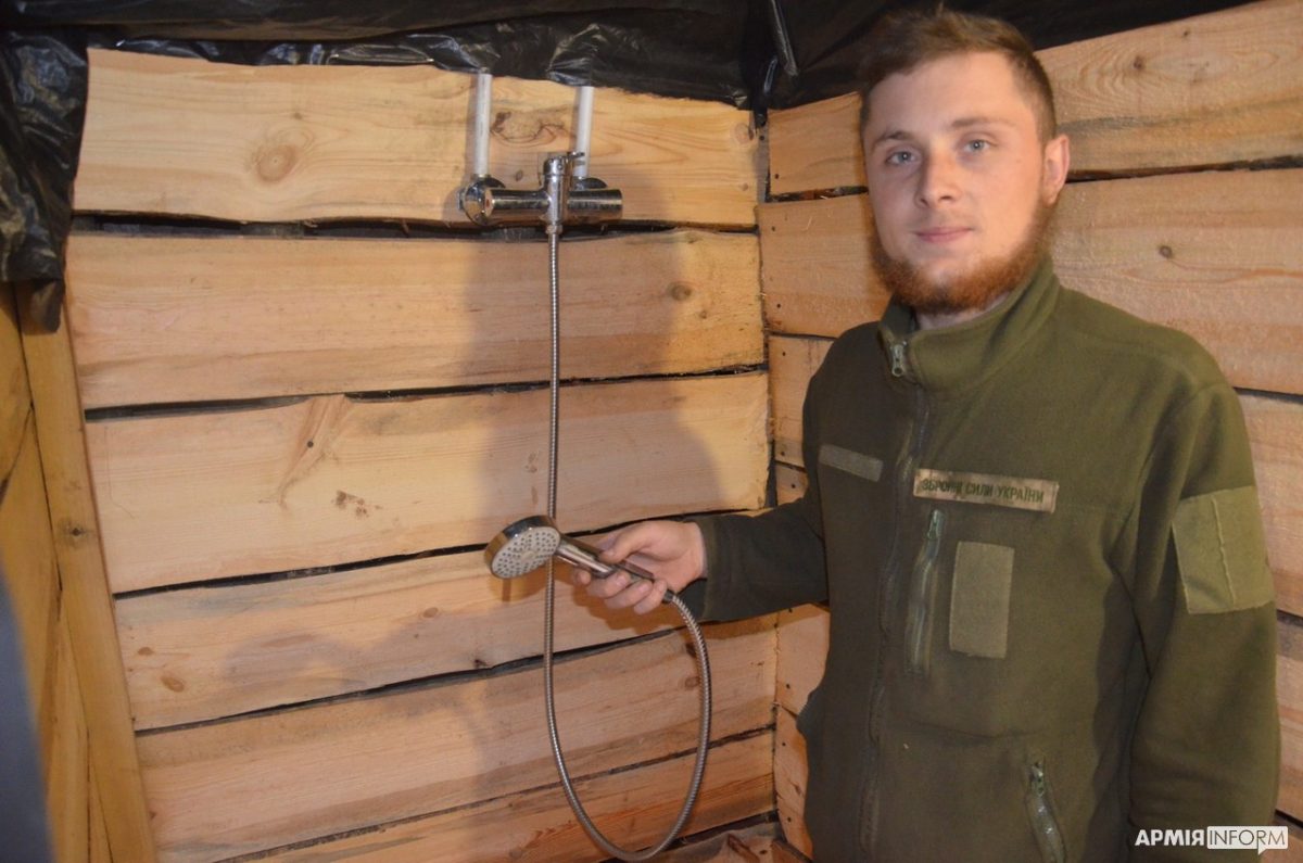 Предмет гордості піхотинців — польова лазня, яку нещодавно військові облаштували просто на позиції. Побудована вона хоч і під землею, але за всіма правилами та традиціями: зі справжньою парною, душовою та роздягальнею. Одним з авторів проєкту цієї побудови став сержант Володимир. Він, як і його батько, столяр, тож щоразу намагається втілити свої творчі ідеї в життя навіть на передовій.