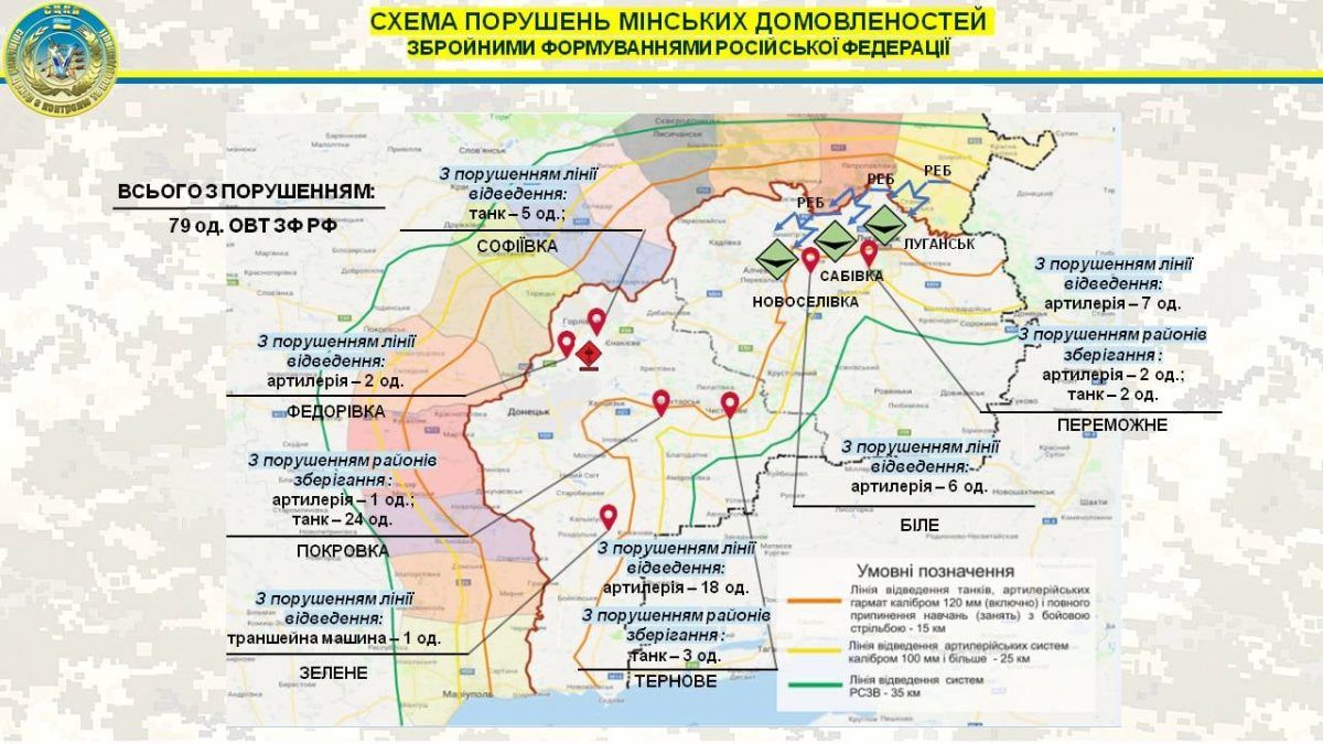 Загалом патрулі Місії зафіксували 79 одиниць бронетанкового та артилерійського озброєння збройних формувань Російської Федерації, розміщених як з порушенням ліній відведення, так і поза межами визначених районів зберігання.
