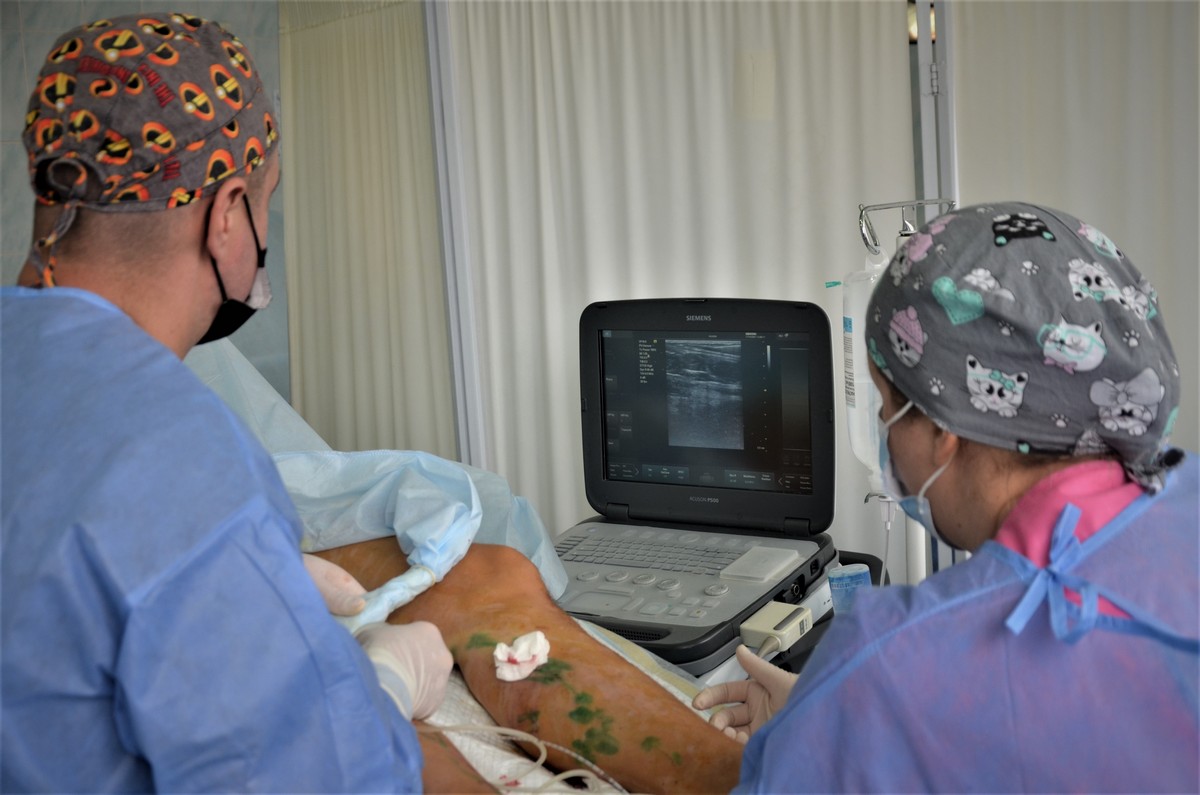 За такої ситуації серед новітніх методів лікування у нас прижилось застосування апарату для проведення ВАК-терапії ран, тобто хірургічний відсмоктувач виділення з ран. Застосовуємо повторні обробки ран з використанням ультразвукових спеціальних приладів, очищаємо рани та судинні пучки й за допомогою лазера. Все це робиться, щоби подавити інфекцію, яка унеможливлює вшитій судині нормально прижитися. Якщо вчасно не прибрати інфекційні ускладнення, це може призвести до втрати кінцівки. Тому заключний етап лікування, до якого за потреби долучаються травматологи, нейрохірурги, пластичні хірурги, інколи триває кілька місяців. Для пересічного громадянина такий копіткий труд військових лікарів залишається поза видимістю. Родичі, друзі, приятелі пораненого, як правило, бачать лише кінцевий результат — їхнього захисника врятовано, він продовжить після певного терміну реабілітації життя у звичайному режимі. А дехто після таких важких оперативних втручань ще й повертається на фронт.