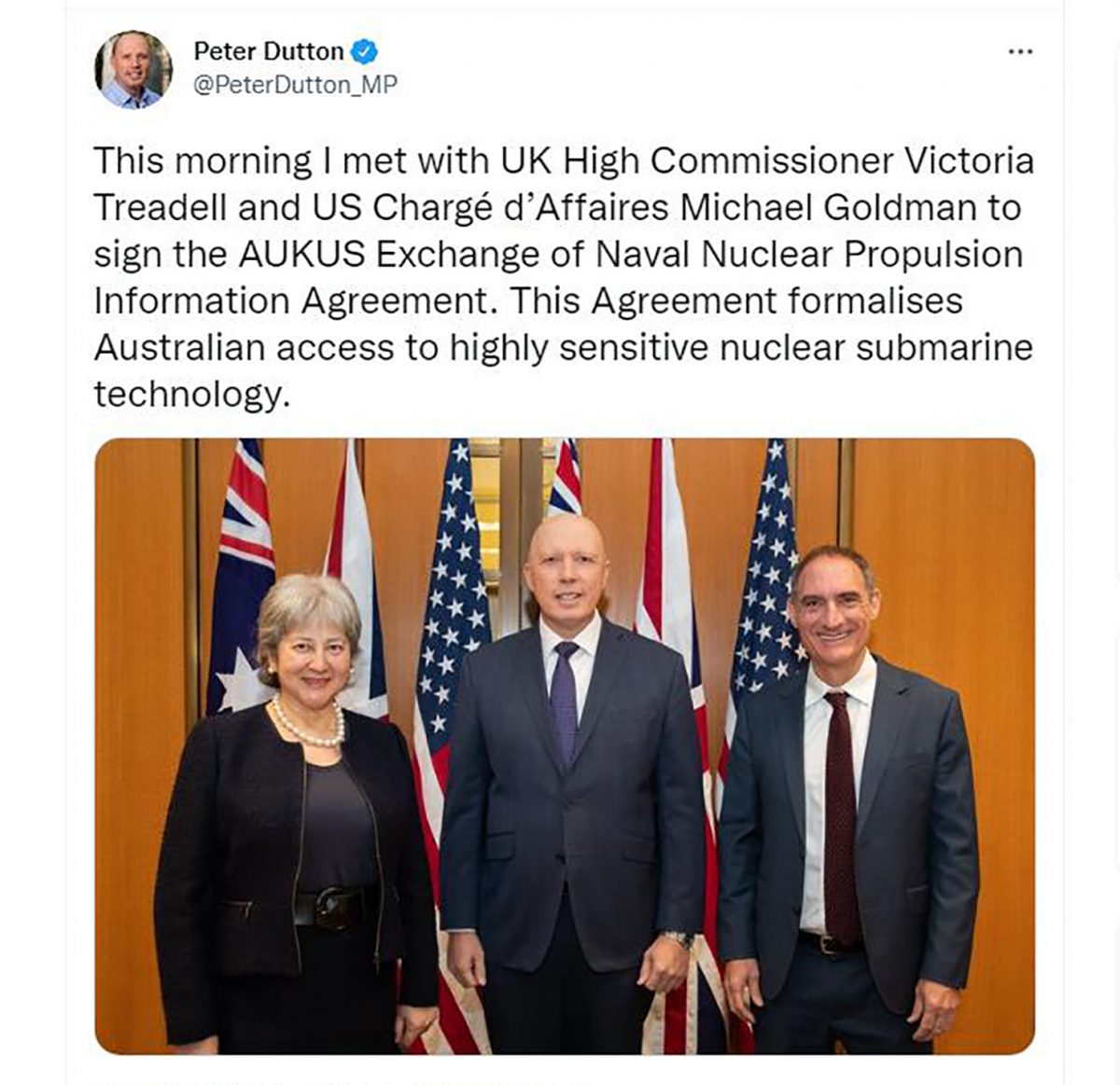 Сьогодні, 22 листопада, міністр оборони Австралії Пітер Даттон разом із американськими та британськими дипломатами підписали угоду щодо взаємного обміну конфіденційною інформацією про ядерні силові установки у рамках оборонного альянсу AUKUS. Про це повідомляє Deutsche Welle.