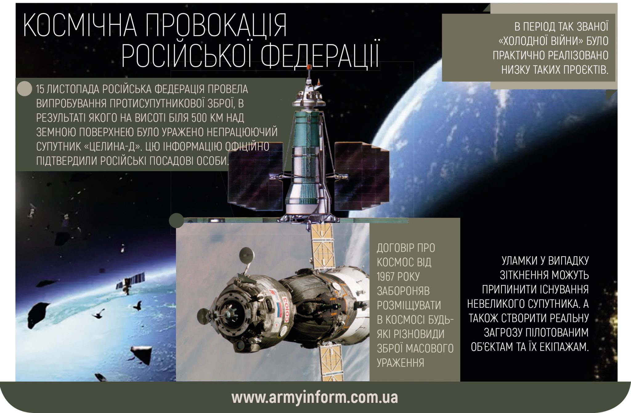 15 листопада Російська Федерація провела випробування протисупутникової зброї, в результаті якого на висоті близько 500 км над земною поверхнею було уражено неактивний супутник «Целина-Д». Цю інформацію офіційно підтвердили російські посадові особи. Зокрема, міністр оборони Сергій Шойгу зазначив з цього приводу, що «ми дійсно успішно випробували перспективну систему. Вона ювелірно уразила старий супутник…», не забувши при цьому додати, що будь-яких загроз для космічної діяльності фрагменти ураженого супутника нібито не становлять.