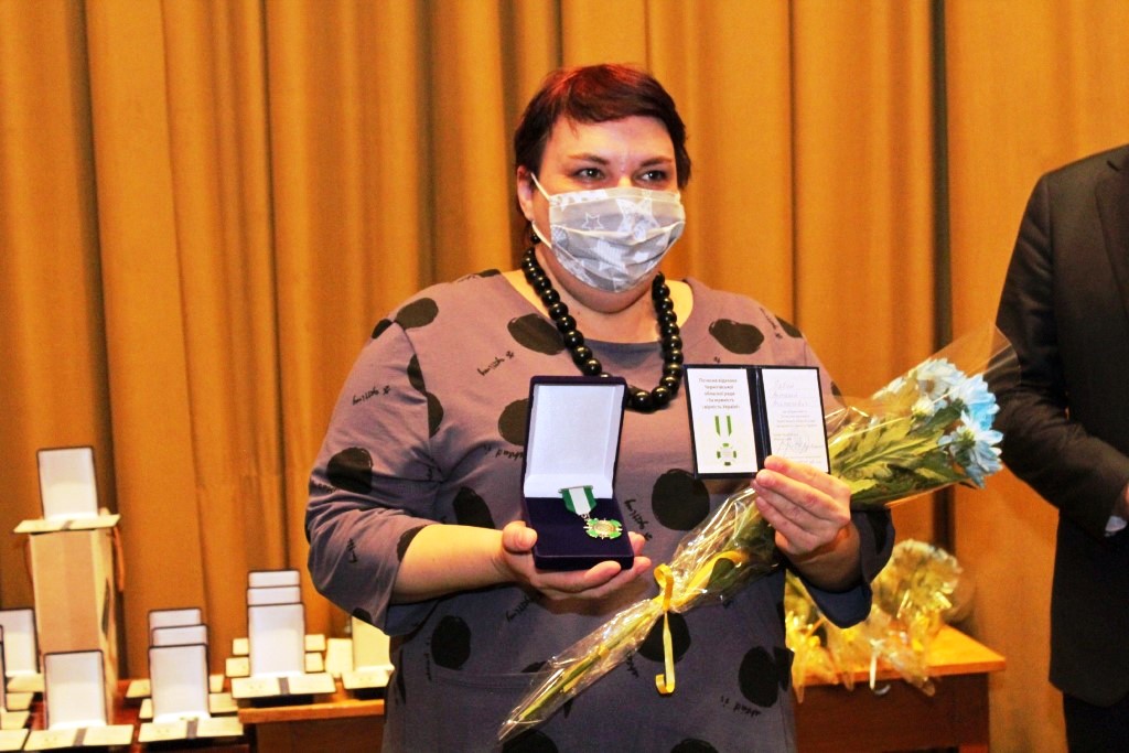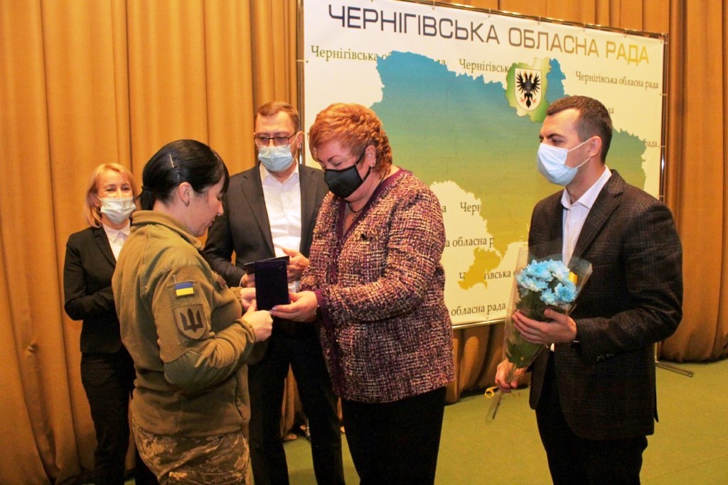 У Чернігові голова обласної ради Олена Дмитренко разом з очільником облдержадміністрації В’ячеславом Чаусом та іншими місцевими посадовцями вручили почесні відзнаки Чернігівської облради «За мужність і вірність Україні» (посмертно) рідним та близьким полеглих захисників Сіверського краю.