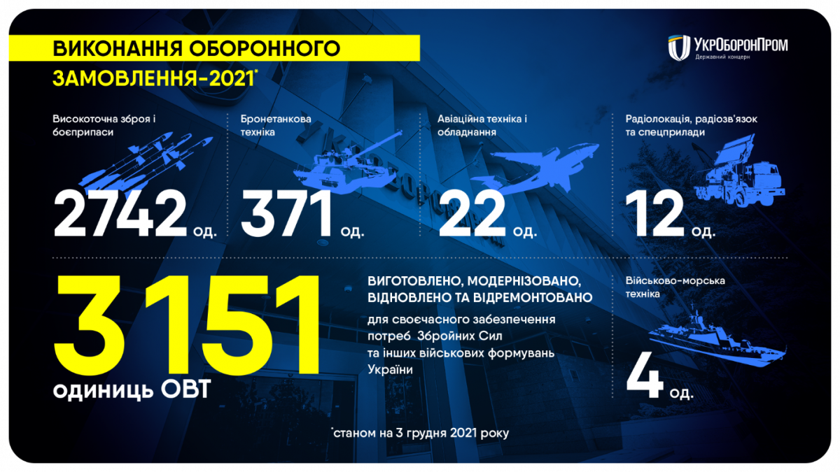 Далі за графіком — традиційна виробнича нарада із заступниками щодо звіту «п’ятого дня», яка відбувається щомісяця. Чув, поза очі колеги називають її нарадою «судного дня». Так, вона не завжди для всіх приємна. Але необхідна — для контролю та аналізу виробничих і фінансових показників діяльності наших підприємств, зокрема спецекспортерів. Кілька місяців тому одне видання дорікнуло мені, що я проводжу забагато нарад. А знаєте,в чому різниця? У показниках ефективності роботи нашої команди. За результатами 2020 року обсяги виробництва підприємствами Концерну зросли на 2% порівняно з 2019-м, а за результатами трьох кварталів цього року ми фіксуємо зростання у 27,4% до аналогічного періоду минулого року. Загальний обсяг виробництва торік становив 30,2 млрд грн, а цього року лише за 9 місяців він становить уже 26,8 млрд грн. За останніми даними — просто на зараз — підприємства Концерну від початку року виготовили, модернізували та відремонтували 3 151 одиницю озброєння та військової техніки: це нові та модернізовані бронетранспортери БТР-4Е, БРЕМ-4РМ, БММ-4С, БТР-70Ді, відремонтовані танки Т-72, Т-64, модернізовані літаки Су-25М1К, Су-27, МіГ-29МУ1 та вертольоти Мі-24ПУ1, ракетно-артилерійське озброєння, новітні РЛС, військово-морська техніка.