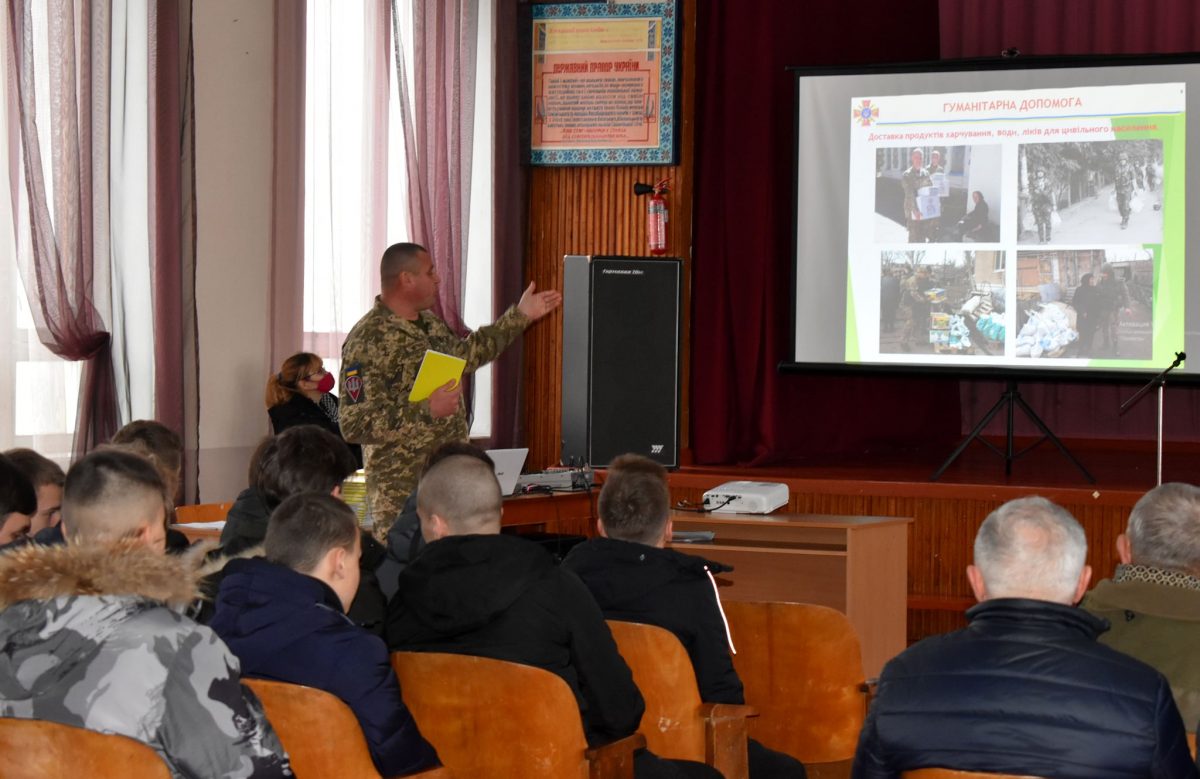 Начальник групи цивільно-військового співробітництва підполковник Роман Сегейда протягом лекції розкрив найбільш характерні небезпеки, які виникають під час збройних конфліктів та надав необхідні поради для мінімізації ризиків, що можуть загрожувати життю і здоров’ю цивільного населення. Впродовж презентації підручника, розданого представникам закладів загальної середньої освіти, було наголошено про важливість дотримання алгоритму зазначених дій для виживання під час надзвичайних ситуацій та в умовах війни.