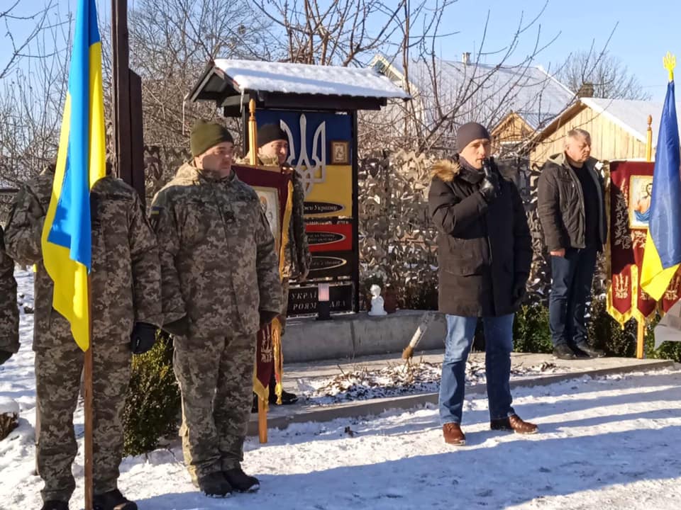 Ініціаторами встановлення меморіалу стала місцева родина Дмитришиних: Анатолій та Людмила, які є учасниками бойових дій. Подружжя пішло на передову слідом за сином Олександром — мама у 2016-му в 57-му ОМБр, а невдовзі й тато — у 59-ту ОМБр. На сході чоловік зазнав поранення, дружину ж «списали» за віком. Сьогодні вони переживають за сина, який у районі проведення бойових дій із 2014 року.