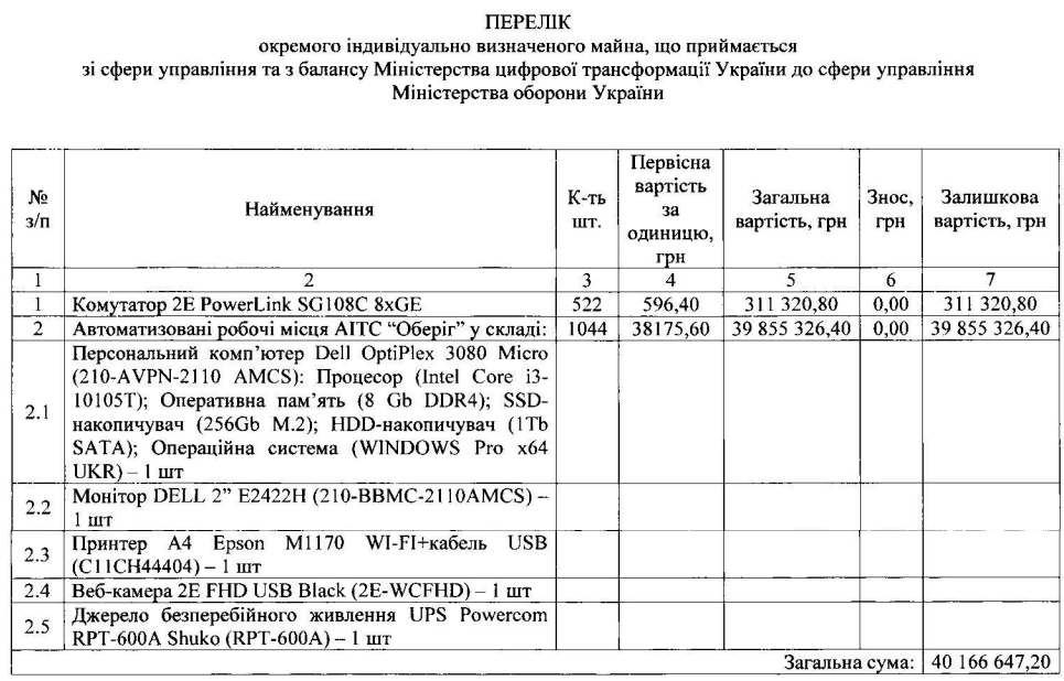 Кожне АРМ складається з комп’ютера Dell OptiPlex 3080 Micro, монітора Dell E2422H, принтера А4 Epson M1170, вебкамери 2E FHD USB Black та джерела безперебійного живлення UPS Powecom RPT-600A Shuko. Загальна вартість цього обладнання 39 855 326,40 грн.
