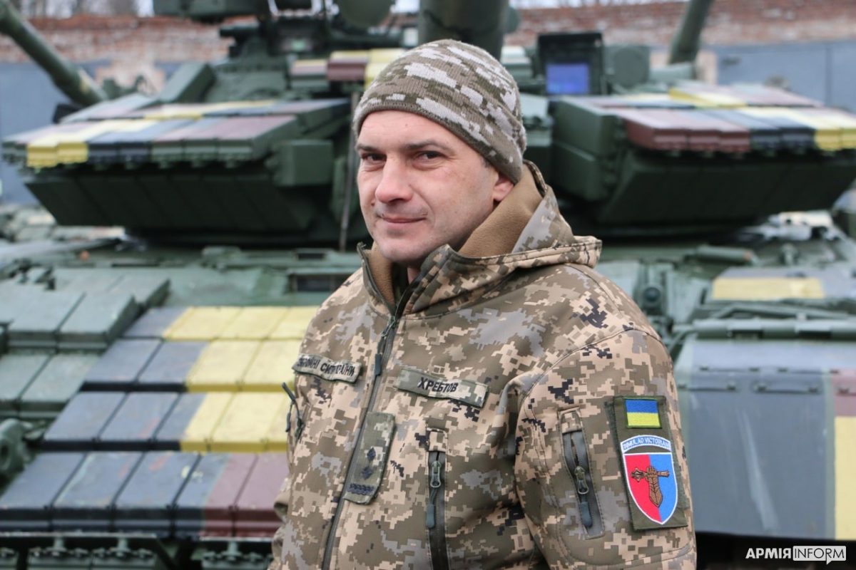 Командир танкового батальйону бригади імені гетьмана Виговського підполковник Максим Хребтов зустрічає мене в парку бойових машин. У зразковому порядку вишикувані танки, а біля входу стоїть залізний чоловік з піднятим у вітанні капелюхом циліндром. Максим усміхається: «Це творчість наших танкістів. Побачиш таке вітання — і настрій поліпшується».