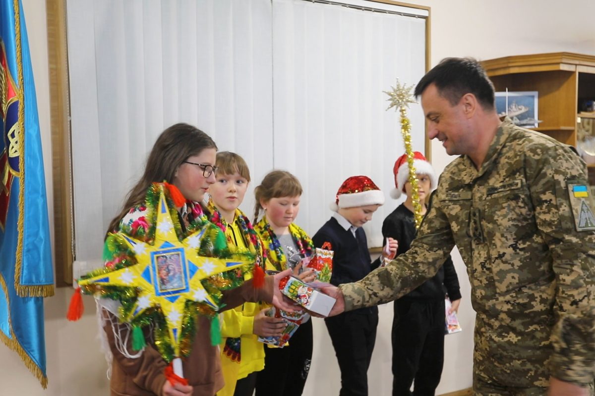 Звісно, колядників не відпустили із порожніми руками. Військовослужбовці віддячили дітлахам солодкими подарунками.