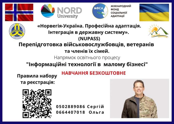 14 лютого розпочинається безоплатний 3-х місячний курс «Основи підприємництва: відкриття власної справи» для ветеранів АТО/ООС, військовослужбовців та членів їхніх сімей. Курс функціонуватиме в рамках проєкту «Норвегія-Україна» на базі Ужгородського національного університету.