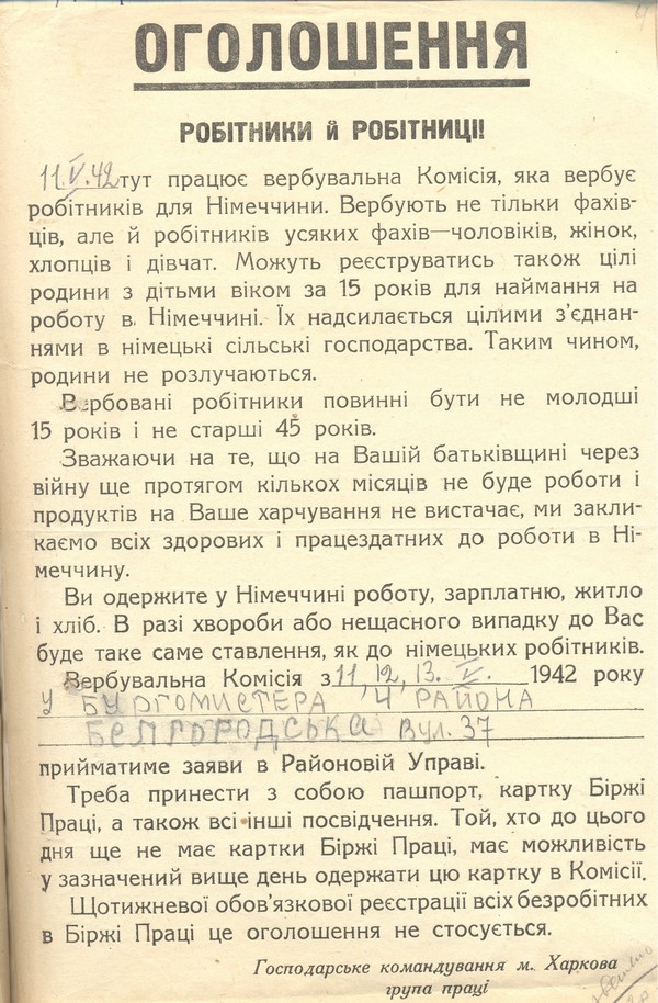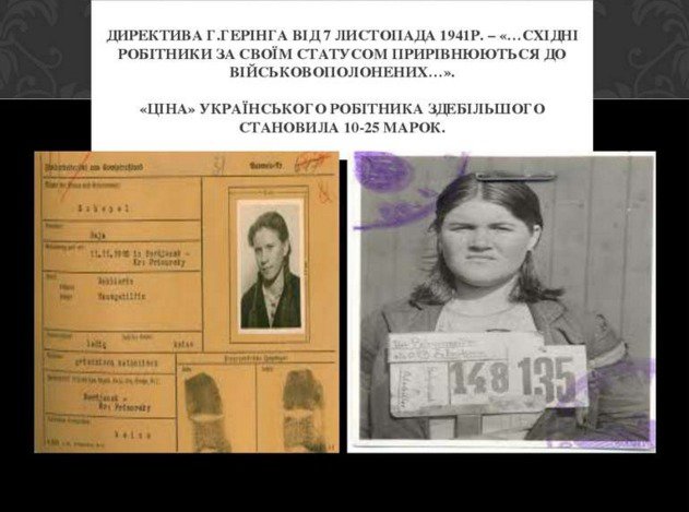 Плануючи війну з СРСР, верхівка Німеччини не передбачала використання примусової праці його громадян у німецькій промисловості: Гітлер вважав, що «негоже користуватися послугами людей, яких важко назвати людьми». Тож план «Барбаросса» передбачав їхнє фізичне винищення і колонізацію «звільнених земель «вищою расою». Та не так сталося, як гадалося: зрив бліц-кригу і необхідність мобілізувати майже все чоловіче населення на фронт, змусили фюрера змінити плани. Зауважимо, що спочатку окупаційний режим в Україні діяв більш менш цивілізовано щодо використання праці українців. Наприклад, він почав агітаційно-пропагандистську кампанію, обіцяючи тим, хто погодиться добровільно поїхати до рейху, золоті гори. І вже 18 січня 1942 року перший ешелон із 1 117 українцями вирушив із Харкова до Кельна. 21 січня за ним рушив і другий ‒ до Бранденбурга.
