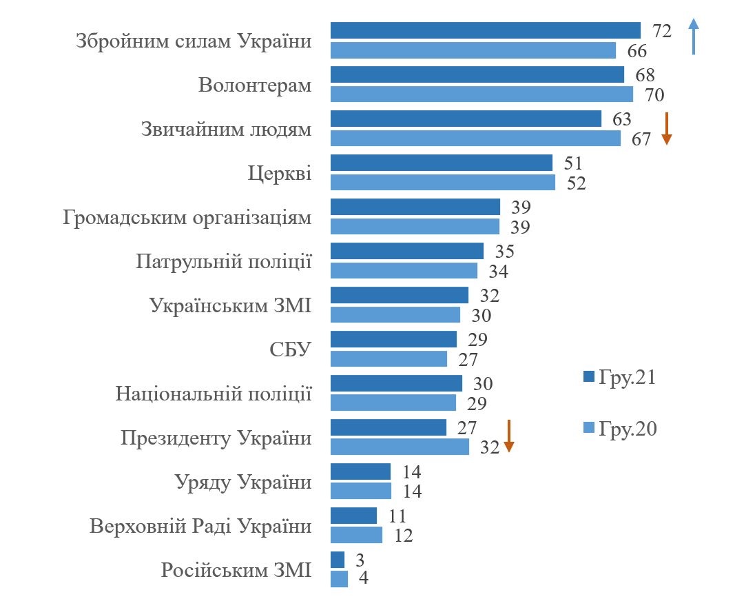 Найбільшою довірою в українському суспільстві продовжують користуватися армія, волонтери, звичайні люди у своєму населеному пункті та церква. При цьому, за останній рік простежується зростання довіри до Збройних Сил України.