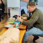 Заняття провів військовий медик, ветеран АТО Антон Вторигін. Він розповів учасникам, як правильно зупиняти кровотечі, що робити при вогнепальних пораненнях, опіках та зупинці серця, ознайомив із вмістом військової аптечки, а також продемонстрував основні правила серцево-легеневої реанімації, поділився досвідом, як діяти при переламах у разі ДТП.