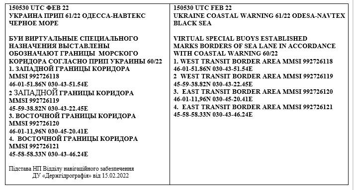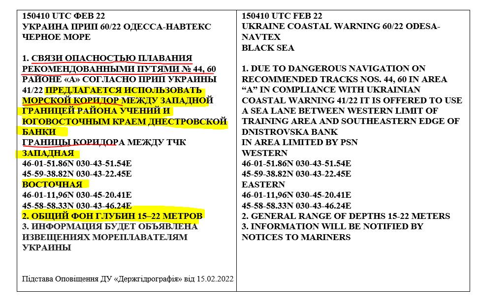 15 лютого керівник проєкту Інституту Чорноморських стратегічних досліджень Андрій Клименко на своїй сторінці у фейсбук повідомив, що за даними Моніторингової групи BlackSeaNews, станом на 08-00 за київським часом 15.02.2022 Держгідрографія у фантастично стислі терміни виконала проміри глибин та визначила новий рекомендований шлях (коридор) для проходу торговельних суден до чорноморських портів України (глибини 15-20 метрів).