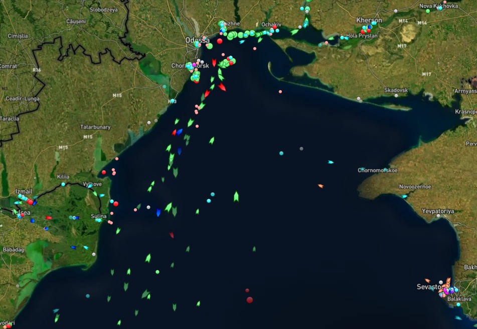 Деякі судна продовжують йти традиційним рекомендованим шляхом, тобто через закритий РФ район навчань (що свідчить про те, що він не охороняється, тобто досі є фейковим, тобто інструментом економічної війни). Фото 3