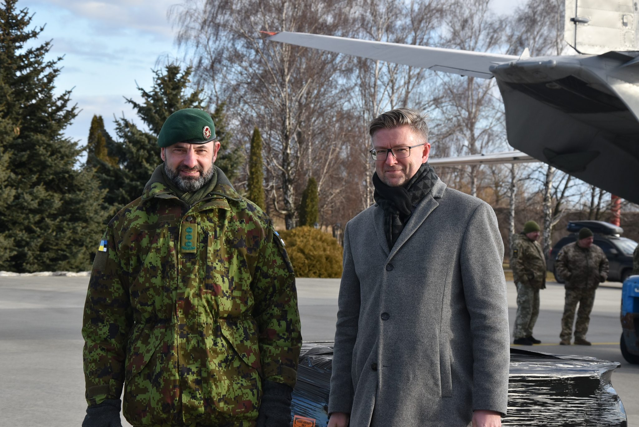 Літак із вантажем зустріли заступник Міністра оборони України Володимир Гаврилов та Надзвичайний і Повноважний Посол Естонської Республіки в Україні Каймо Кууск.
